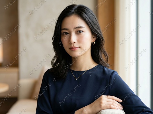 画像素材:窓から差し込む柔らかな光を浴びて、静かに佇む女性のポートレートです。紺色の洗練されたブラウスを身に纏い、耳元には小ぶりながらも存在感を放つゴールドのフープピアスが輝いています。首元には細身のチェーンネックレスが添えられ、大人の女性らしい上品なアクセサリー使いが目を引きます。ウェーブがかった黒髪が肩に美しく流れ、落ち着いた知的な雰囲気と、どこか芯の強さを感じさせる眼差しが印象的です。背景の室内は明るいトーンでまとめられ、窓の外の柔らかなボケ味が被写体の輪郭を優しく際立たせています。肌の質感や髪の一本一本まで丁寧に描写されており、清潔感のあるメイクが自然な美しさを引き立てています。ジュエリーブランドのプロモーションや、キャリア女性向けのライフスタイル誌の素材として使いやすい一枚です。 この画像はAIによって生成された後、ソフトウェアによって高品質化されています。 画像サイズ:2400 x 1792 px 画像ファイル形式:JPEG ※ご購入前に「ABOUT」から詳細をご確認ください。 https://anoconone.base.shop/about