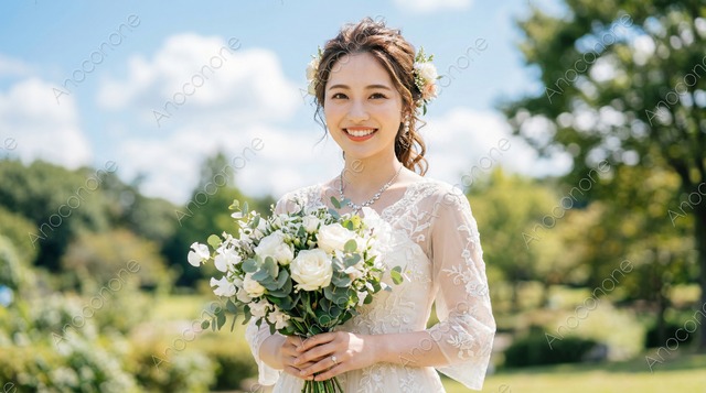 画像素材:爽やかな青空と鮮やかな木々の緑が広がる開放的なロケーションで、繊細な刺繍が施されたウェディングドレスを纏った女性が晴れやかな笑顔を見せています。手元には白バラをメインにユーカリなどのグリーンを合わせたボリューム感のあるクラッチブーケがあり、清楚な装いにナチュラルな華やかさを添えています。ドレスの袖は透け感のあるレース素材で、光を浴びて柔らかく輝き、女性の透明感を引き立てるデザインです。ヘアスタイルは優雅にまとめられ、サイドには小花をあしらった髪飾りが彩りを加え、耳元のパールのイヤリングとネックレスが洗練された気品を感じさせます。背景のボケ味が主役である女性を美しく際立たせ、多幸感に満ちた瞬間を切り取った一枚です。ブライダル広告やパンフレット、結婚準備に関する記事のアイキャッチなど、幸福なイメージを伝えたい媒体に広く活用できます。結婚式の魅力を引き立てる高品質なビジュアル素材です。 この画像はAIによって生成された後、ソフトウェアによって高品質化されています。 画像サイズ:2752 x 1536 px 画像ファイル形式:JPEG ※ご購入前に「ABOUT」から詳細をご確認ください。 https://anoconone.base.shop/about