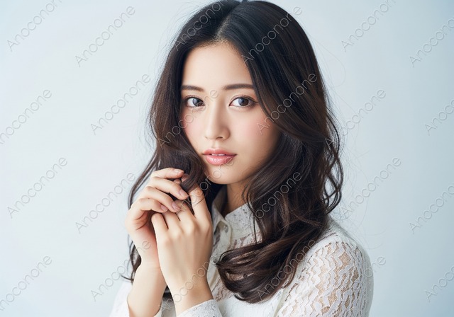 画像素材:繊細な白のレースブラウスを身に纏い、艶やかなロングウェーブヘアが美しい女性を捉えた高品質なポートレートです。柔らかにカールした髪にそっと手を添える仕草が、上品でエレガントな雰囲気を醸し出しています。無垢な白を基調とした背景と、透明感あふれる彼女の肌が絶妙に調和し、清潔感と洗練された美しさを際立たせています。落ち着いた表情の中に宿る知的な瞳は、視聴者に強い印象を残します。高級感のある美容・コスメの広告や、上品な女性向けファッションメディア、ブライダル関連のコンテンツ制作を検討されている方に最適な一枚です。 この画像はAIによって生成された後、ソフトウェアによって高品質化されています。 画像サイズ:2560 x 1792 px 画像ファイル形式:JPEG ※ご購入前に「ABOUT」から詳細をご確認ください。 https://anoconone.base.shop/about