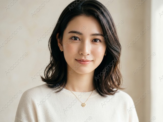 画像素材:穏やかな微笑みを浮かべ、こちらを見つめる女性のポートレートです。鎖骨のあたりには、繊細なデザインのゴールドのネックレスが輝き、耳元にもお揃いの小さなピアスが添えられています。黒髪に近い落ち着いた髪色はゆるやかに巻かれ、肩にかかる長さが上品な印象を与えます。白のシンプルなニットを着用しており、肌の質感や瞳の輝きが非常に細部まで丁寧に描写されています。背景は明るく柔らかな色調でまとめられ、自然光が差し込むような開放感のある雰囲気が特徴です。清潔感のあるメイクと整えられた眉が、知性と優しさを感じさせる表情を引き立てています。派手すぎないアクセサリー使いが、日常の何気ない美しさを演出しています。美容関連の広告や、大人の女性向けのライフスタイルを紹介するコンテンツに最適な一枚です。 この画像はAIによって生成された後、ソフトウェアによって高品質化されています。 画像サイズ:2400 x 1792 px 画像ファイル形式:JPEG ※ご購入前に「ABOUT」から詳細をご確認ください。 https://anoconone.base.shop/about