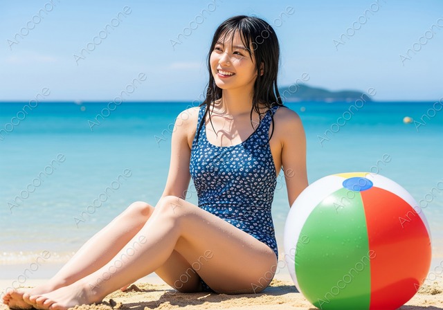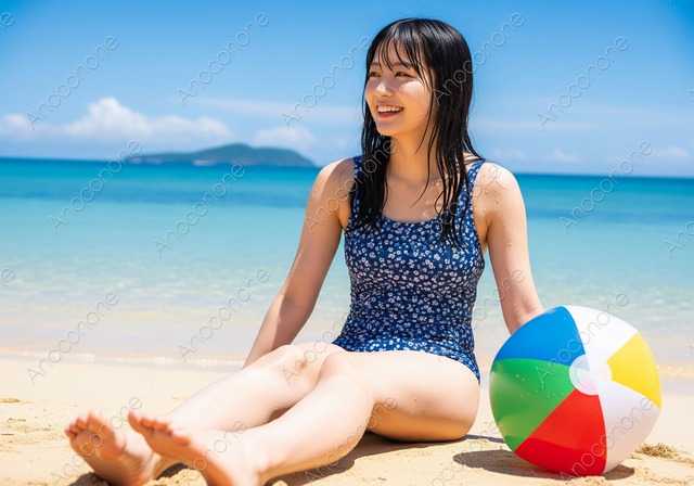画像素材:澄み渡る青空と砂浜でビーチボールを横にリラックスする女性 どこまでも続くような青い空と、透き通ったエメラルドグリーンの海を背景に、砂浜に座ってくつろぐ女性の姿を捉えた一枚です。女性は、白く小さな花柄が散りばめられた落ち着いた紺色の水着を着用しており、背景の自然な色彩と美しく調和しています。視線を少し外し、楽しそうに微笑む表情からは、夏のバカンスを満喫している様子が伝わってきます。隣に置かれたビーチボールは、青、緑、赤、白、黄色といった鮮やかな多色使いで、画面全体に明るい活気を与えています。遠くに見える島影や静かな波打ち際が、穏やかで開放的なリゾート地の雰囲気を強調しています。肌に当たる柔らかな日差しや、砂浜の細かな質感まで丁寧に描写されており、全体として清潔感のある構図になっています。夏の旅行、ビーチレジャー、ファッション関連の広告や、ウェブサイトの爽やかなメインビジュアルとして幅広く活用できる写真素材です。 この画像はAIによって生成された後、ソフトウェアによって高品質化されています。 画像サイズ:2560 x 1792 px 画像ファイル形式:JPEG ※ご購入前に「ABOUT」から詳細をご確認ください。 https://anoconone.base.shop/about