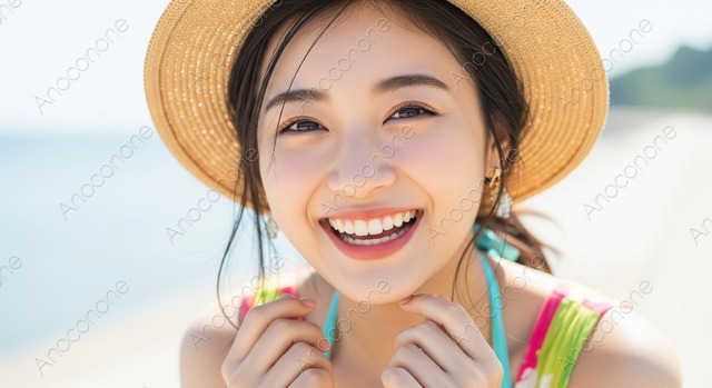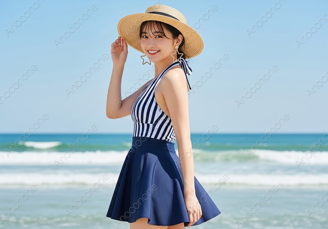画像素材:ドット柄の水着を身にまとい砂浜で微笑むビーチボールを持った女性 どこまでも続く青い海と広大な砂浜を背景に、白地に紺のドット柄が映える水着を着用した女性が、ビーチボールを手に微笑んでいる爽やかな一枚です。女性の背後には波打ち際が広がり、寄せては返す波の白さが夏の海岸の心地よさを強調しています。手に持っているビーチボールは黄色と白のシンプルな配色で、全体の色彩を明るく引き立てる要素となっています。女性の髪は海風を受けたような柔らかな質感で、肩に落ちる黒髪が清楚で健康的な印象を与えます。自然光が均一に当たっており、肌の艶や水滴の細かな表現が非常にクリアに描写されています。背景の海のグラデーションと砂浜の質感がバランスよく配置されており、全体として開放感あふれる構図です。清潔感のある笑顔と落ち着いた色使いが特徴で、夏の観光レジャー、ファッション、ライフスタイルを提案する広告やWebコンテンツの素材として適しています。 この画像はAIによって生成された後、ソフトウェアによって高品質化されています。 画像サイズ:2560 x 1792 px 画像ファイル形式:JPEG ※ご購入前に「ABOUT」から詳細をご確認ください。 https://anoconone.base.shop/about