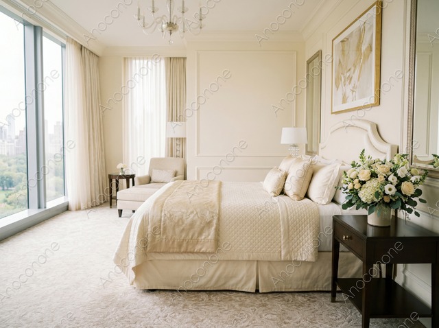 画像素材:都会の景色を望む大きな窓から明るい光が差し込む、気品に満ちたホテルのスイートルームの風景です。中央に配置されたキングサイズのベッドは、質感の良い白いリネンで整えられ、足元のオットマンには豪華な白いバラのブーケが飾られています。室内はベージュやオフホワイトのトーンで統一されており、柔らかな間接照明が温かみのある雰囲気を演出しています。ベッドサイドのテーブルにはシャンパンセットやジュエリーボックスが用意され、特別な一日の始まりを予感させます。窓の外には豊かな緑が広がり、プライベート感のある落ち着いた空間が広がっています。細部まで手入れが行き届いたインテリアが、非日常的な贅沢さと安らぎを同時に与えてくれます。ウェディングの準備風景や、高級な宿泊プランを紹介する素材として重宝する一枚です。 この画像はAIによって生成された後、ソフトウェアによって高品質化されています。 画像サイズ:2400 x 1792 px 画像ファイル形式:JPEG ※ご購入前に「ABOUT」から詳細をご確認ください。 https://anoconone.base.shop/about