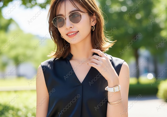 柔らかな春の日差しの中で髪を整え微笑む女性