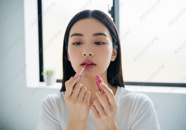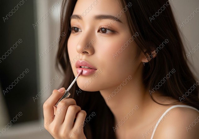 透明感のある肌を持つ女性が、白いトップスを着用し、丁寧にピンクの口紅を塗っているクローズアップポートレートです。鏡を見つめるかのような視線を落とし、唇に色を乗せる真剣な表情が、日々のビューティールーティンと自己磨きの時間を表現しています。コスメ、美容、リップメイク、セルフケアといったテーマの広告やウェブコンテンツに最適な一枚です。 この画像はAIによって生成された後、品質を向上させるためにレタッチされています。 画像サイズ:2560 x 1792 px 画像ファイル形式:JPEG ※ご購入前に「ABOUT」から詳細をご確認ください。