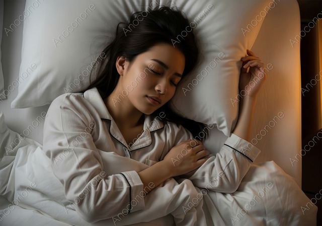 温かい光が差し込む寝室で、白いパジャマを着た女性が眠っている一枚です。白い寝具に包まれ、穏やかな表情で眠る姿が、心安らぐ時間を豊かに表現しています。安眠、快眠、リラックス、心地よい日常を表現するのに最適な写真です。寝具、ヘルスケア、ライフスタイルなど、幅広いテーマでご活用いただける高クオリティな素材です。 この画像はAIによって生成された後、品質を向上させるためにレタッチされています。 画像サイズ:2560 x 1792 px 画像ファイル形式:JPEG ※ご購入前に「ABOUT」から詳細をご確認ください。