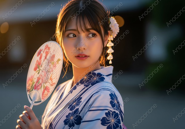 夕暮れの光の中で団扇を持ち艶やかな表情を浮かべる浴衣の女性