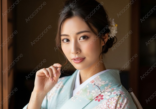 画像素材:淡い水色に桜の模様が描かれた着物を着用した女性のポートレートです。髪には白い花飾りを付け、穏やかで優雅な表情でカメラを見つめています。背景は日本の伝統的な室内空間の暗がりで、窓からの柔らかな光が女性の顔を美しく照らしています。日本の伝統文化、観光、和風のイメージを訴求するのに最適な素材です。 この画像はAIによって生成された後、品質向上のためにレタッチされています。 画像サイズ:2560 x 1792 px 画像ファイル形式:JPEG ※ご購入前に「ABOUT」から詳細をご確認ください。
