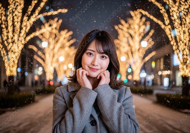 画像素材:シャンパンゴールドに煌めく幻想的なイルミネーションを背景に、柔らかな微笑みを浮かべる女性の姿を捉えた一枚です。夜の街を彩る無数の光がボケ味として美しく溶け込み、冬の特別な夜の温かみと高揚感を演出しています。グレーのシックなコートを身に纏い、顔周りに手を添えた可憐なポーズは、見る人に親しみやすさと上品な印象を同時に与えます。冬のデートシーンや観光プロモーション、ファッション誌の特集ページなど、華やかでロマンチックな雰囲気を求めるデザイン制作に最適な高品質素材です。 この画像はAIによって生成された後、Topaz Photoによって超高画質化されています。 画像サイズ:2560 x 1792 px 画像ファイル形式:JPEG ※ご購入前に「ABOUT」から詳細をご確認ください。