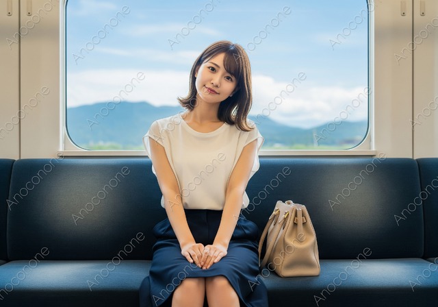 画像素材:夏の陽光が差し込む電車内で山々を背景に微笑むワンピース姿の女性 走行中の電車の座席に座り、穏やかな表情でこちらを見つめる女性を正面から捉えた一枚です。女性は清潔感のある白いフレンチスリーブのブラウスに、落ち着いたネイビーのスカートを合わせた上品な装いで、傍らにはベージュのハンドバッグが置かれています。大きな車窓からは、澄み渡る青空と緑豊かな山々の絶景が広がり、旅の情緒と開放感を演出しています。車内に差し込む明るい自然光が、女性の肌の透明感や衣服の柔らかな質感を美しく際立たせています。左右の対称性を意識した構図が画面に安定感を与え、静かで贅沢な移動時間を表現しています。鉄道旅行のプロモーション、観光ガイド、ライフスタイル誌のメインビジュアルなど、夏の小旅行や帰省の魅力を伝えたい場面に最適です。細部まで鮮明に描写された、空気感の伝わる高品質な素材です。 この画像はAIによって生成された後、ソフトウェアによって高品質化されています。 画像サイズ:2560 x 1792 px 画像ファイル形式:JPEG ※ご購入前に「ABOUT」から詳細をご確認ください。 https://anoconone.base.shop/about