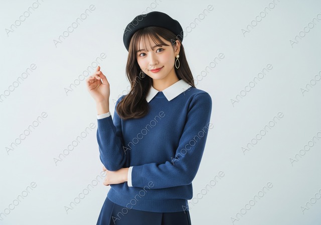 画像素材:明るいスタジオで撮影された、ネイビーのニットに白の丸襟を合わせた清楚なファッションの女性の画像です。ベレー帽と揺れるイヤリングがアクセントになっており、知的で可愛らしい雰囲気を演出しています。アパレルや美容関連のウェブサイト、広告、SNS投稿などで、春のファッション提案や商品のイメージモデルとしてご活用いただけます。 この画像はAIによって生成された後、品質向上のためにレタッチされています。 画像サイズ:2560 x 1792 px 画像ファイル形式:JPEG ※ご購入前に「ABOUT」から詳細をご確認ください。