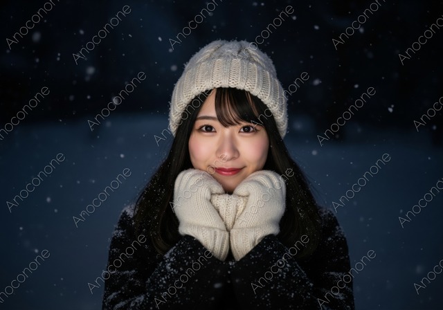 雪が降る冬の夜に白いニット帽と手袋姿で微笑む女性
