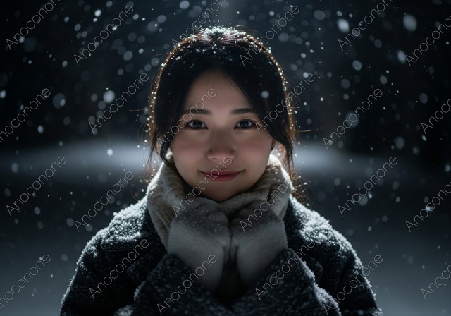 画像素材:暗い夜に降りしきる雪の中、白いマフラーと手袋を着用し、カメラに向かって優しく微笑む女性をクローズアップで捉えた幻想的なポートレート素材です。頭や肩に雪が積もり、冷たい空気感と温かい表情の対比が印象的で、冬の季節感を強調したい広告、ウェブデザイン、SNSコンテンツ、パンフレットなどに感動的な視覚効果をもたらします。 この画像はAIによって生成された後、品質向上のためにレタッチされています。 画像サイズ:2560 x 1792 px 画像ファイル形式:JPEG ※ご購入前に「ABOUT」から詳細をご確認ください。
