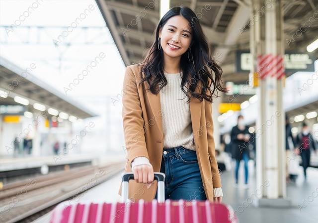駅のホームで、ブラウンのジャケットにデニムを合わせたスタイルで、スーツケースを引く女性のポートレートです。ゆるいウェーブのかかった美しい髪と、心からの笑顔が、旅の始まりのワクワク感と楽しさを伝えています。ファッション、旅行、ライフスタイル、休日の過ごし方に関するコンテンツに最適な、明るく魅力的な一枚です。 この画像はAIによって生成された後、品質向上のためにレタッチされています。 画像サイズ:2560 x 1792 px 画像ファイル形式:JPEG ※ご購入前に「ABOUT」から詳細をご確認ください。