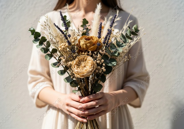 可憐なドライフラワーのブーケを手に持つ清楚な装いの女性