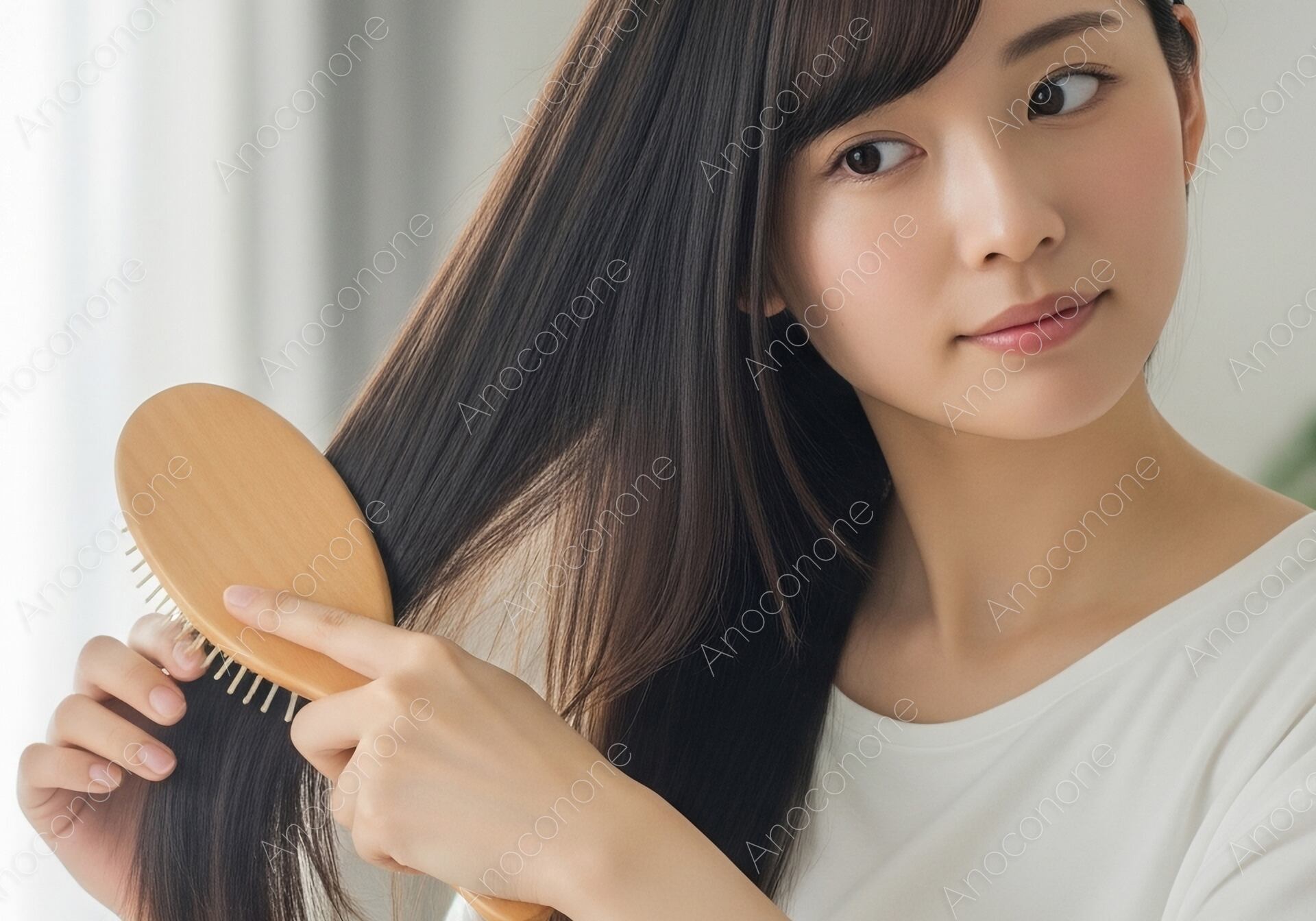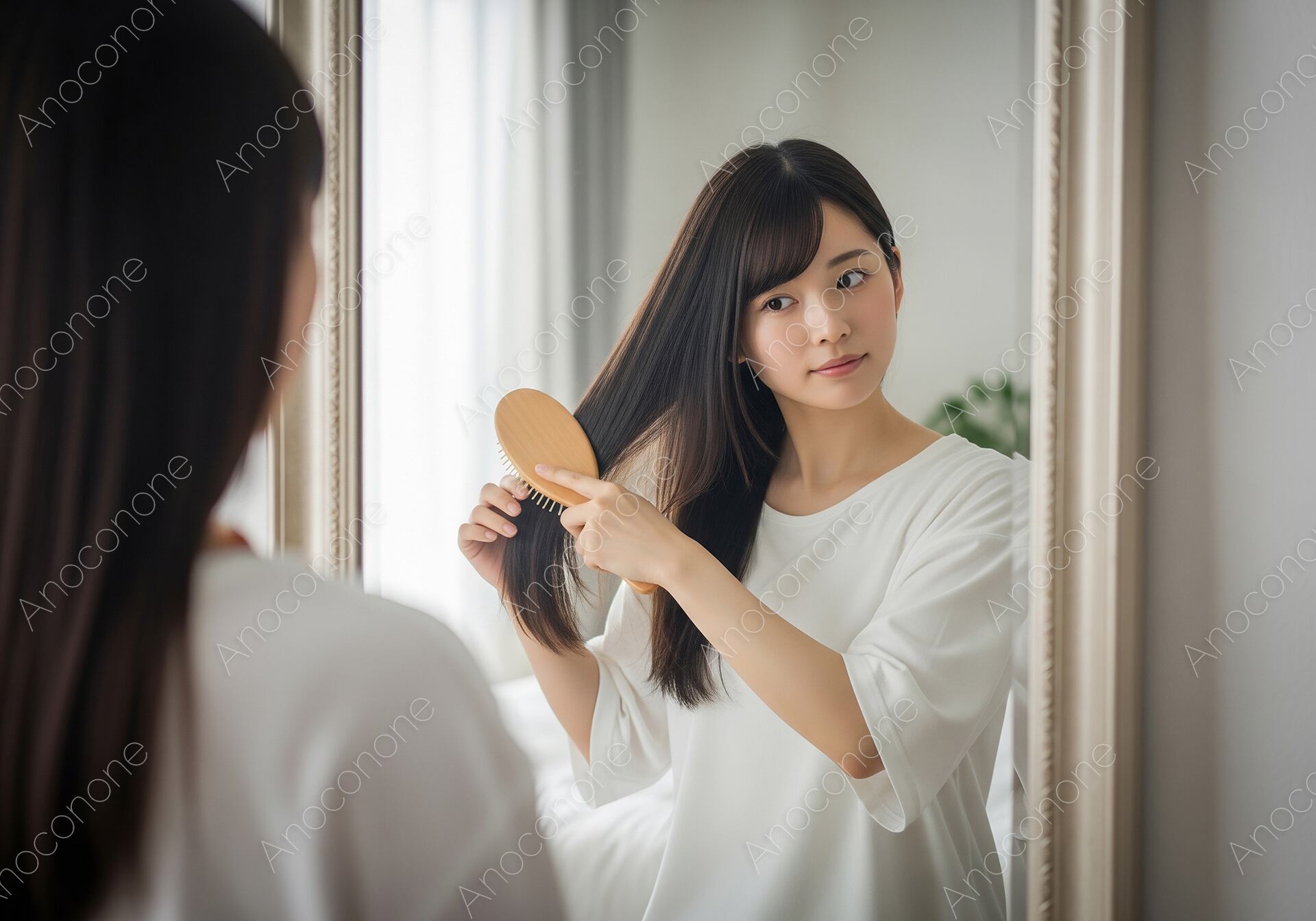 画像素材:鏡に向かって優しく髪をブラッシングする、日常のひとコマを切り取った一枚です。窓から差し込む柔らかな自然光が、女性の艶やかな黒髪と透明感のある肌を美しく引き立てています。清潔感あふれる白いシャツを身に纏い、落ち着いた表情でセルフケアに励む姿は、見る人に安らぎと美意識の高さを感じさせます。丁寧な暮らしや、朝のルーティンを象徴するような瑞々しい空気感が魅力です。高品質な解像度により、髪の質感一本一本まで繊細に表現されており、リアリティ溢れる仕上がりとなっています。美容業界の広告、ヘアケア製品のプロモーション、またはライフスタイルを提案するメディアのアイキャッチ画像として非常に使いやすく、視覚的な訴求力に優れた素材です。