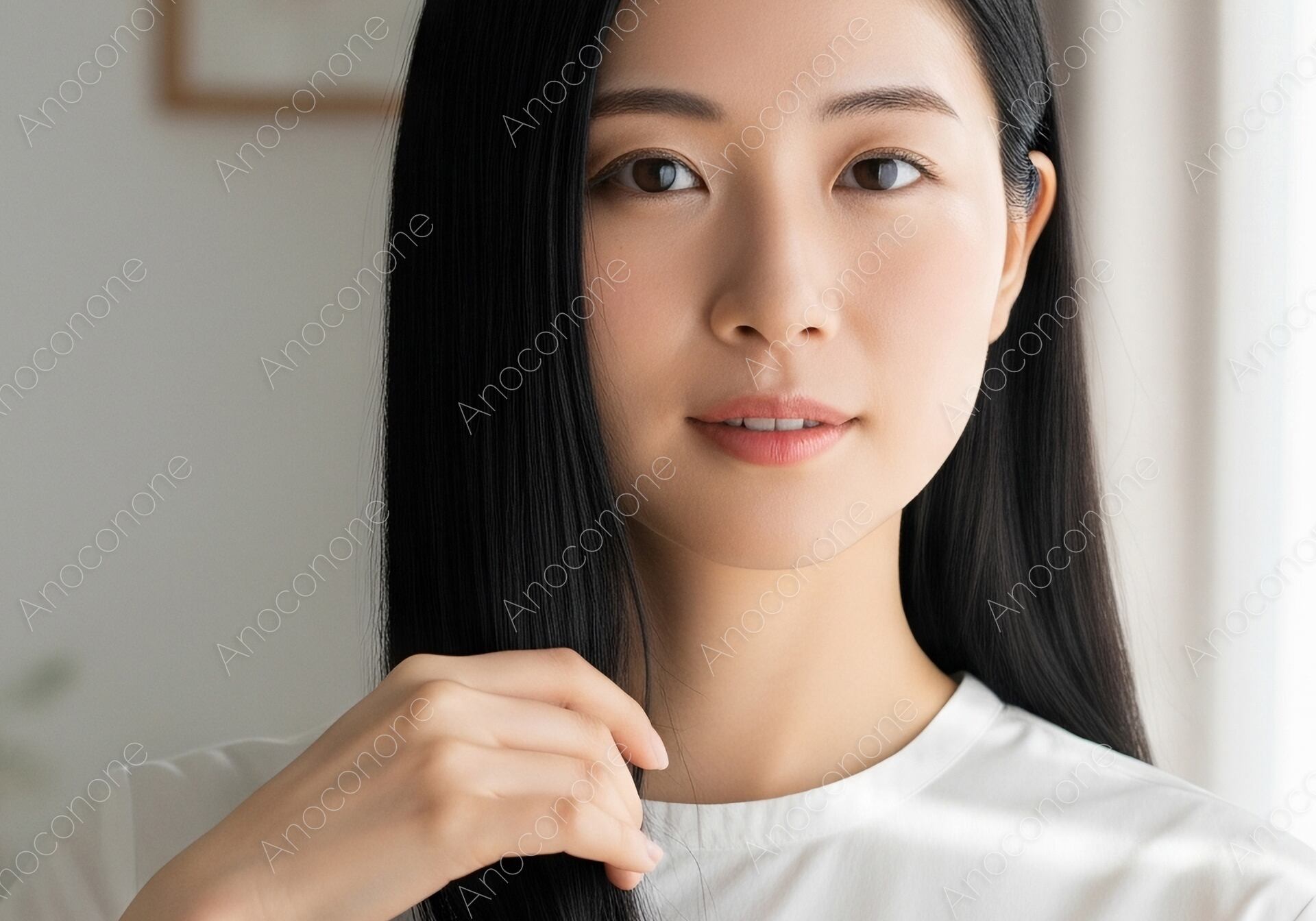 画像素材:明るい窓際で、艶やかなストレートの黒髪を指先で優しく整える女性のポートレートです。背景には落ち着いたトーンのインテリアが広がり、日常の中にある上質な美しさを表現しています。カメラを真っ直ぐに見つめる視線は知的で優しく、見る人に深い信頼感と安心感を与えます。自然光が細かな毛流れまで鮮明に映し出し、健康的な髪の質感と透明感のある肌が際立つ一枚です。清潔感のある白い衣装が、全体を明るく爽やかな印象にまとめています。美容液やシャンプーの広告、スキンケアブランドのプロモーション、健康的なライフスタイルを提案するブログのメインビジュアルなど、美をテーマにした幅広いビジネスシーンに最適です。