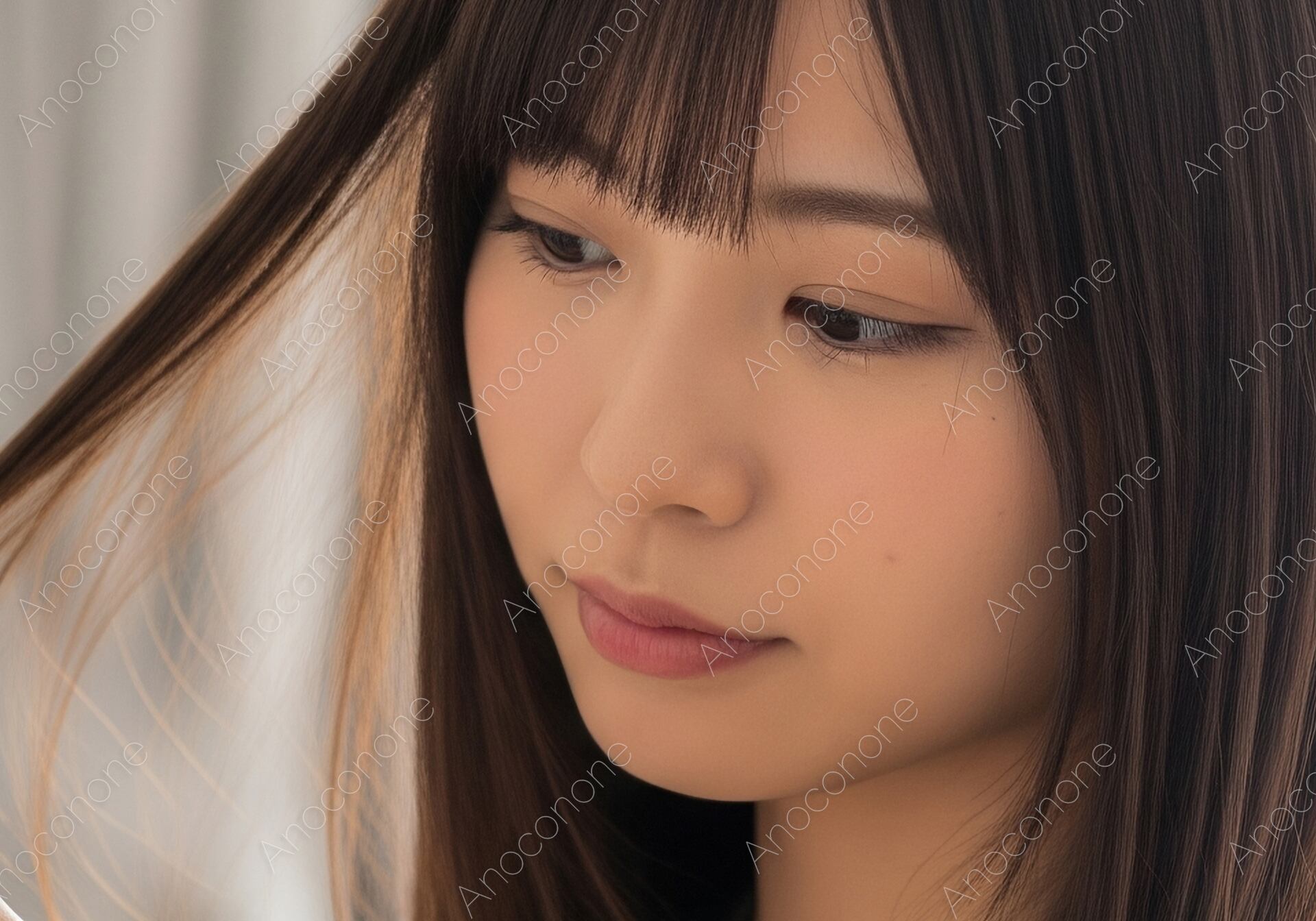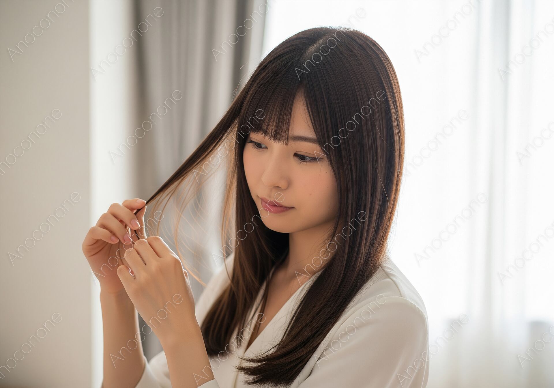画像素材:窓から差し込む柔らかな光の中で、自身の髪の状態を真剣に見つめる女性の姿を捉えた一枚です。指先で毛先を軽く持ち上げ、質感や傷みをチェックする繊細な仕草が、美意識の高さを物語っています。落ち着いたトーンの室内と、女性の清楚な白いブラウスが調和し、清潔感あふれる上品な雰囲気を演出しています。滑らかな髪の毛一本一本まで高精細に描写されており、リアリティのある質感が広告素材としての価値を高めています。日々のヘアケアの重要性や、自分自身と向き合う静かな時間を象徴するような瑞々しい表現が魅力です。シャンプーやトリートメントなどのヘアケア製品、美容クリニック、あるいはセルフケアをテーマにしたライフスタイルメディアのアイキャッチ画像として、ターゲット層の共感を得るのに最適な素材です。