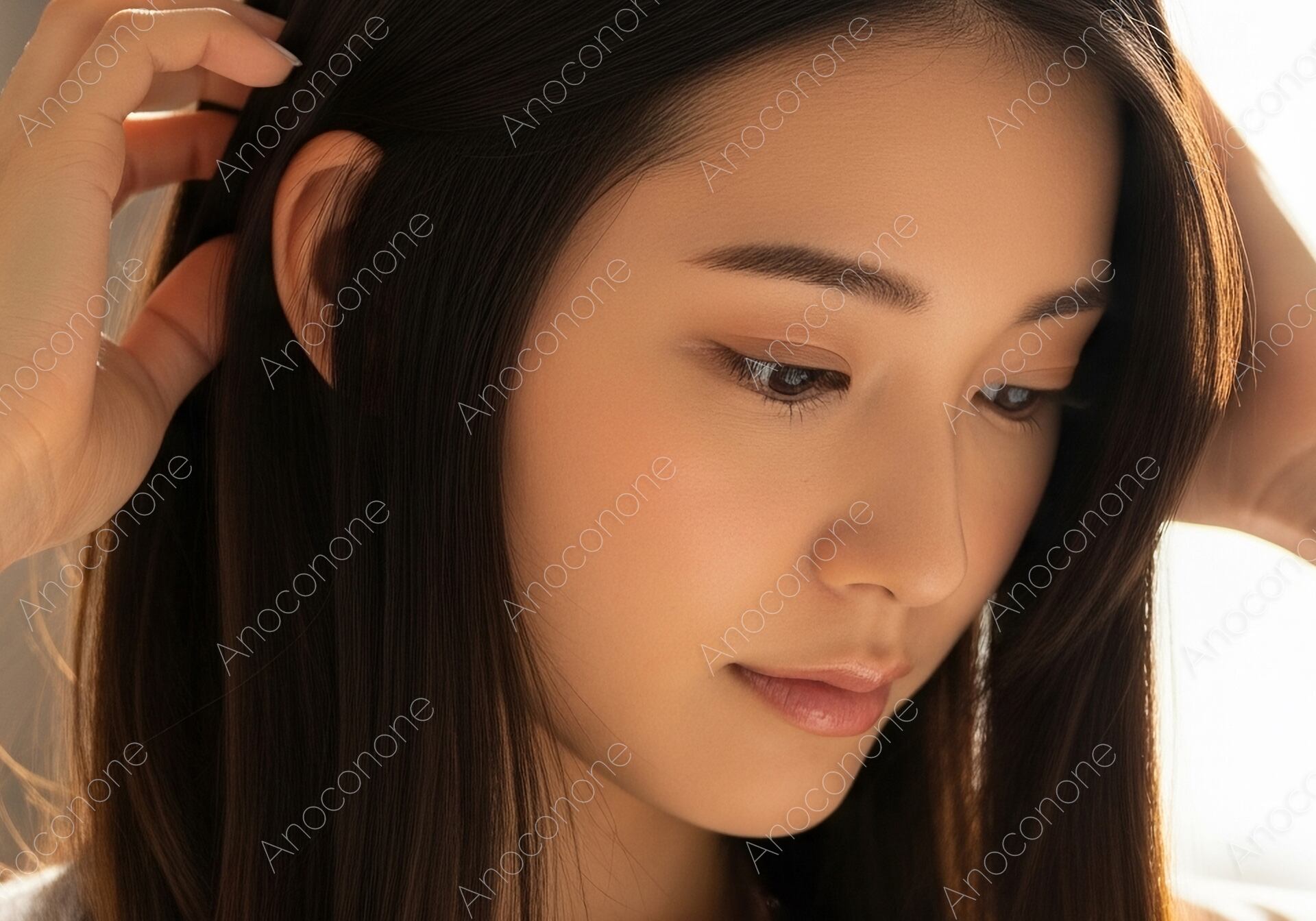 画像素材:窓から差し込む暖かな自然光に包まれ、手ぐしで丁寧に髪の流れを整える女性の姿を捉えた一枚です。落ち着いた室内の雰囲気と、女性の穏やかな表情が調和し、日常の中の静かで贅沢なセルフケアの時間を表現しています。しなやかな指先が髪に触れる仕草は、見る人に上品で清潔感あふれる印象を与え、健康的な髪の輝きを際立たせています。高精細な描写により、光を受けた髪の繊細な質感や、肌の透明感まで見事に再現されており、非常にリアリティのある仕上がりです。シンプルな構図ながらも、内面から溢れる美しさを感じさせるビジュアルとなっています。ヘアケア製品のプロモーション、美容サロンのイメージ画像、あるいは「丁寧な暮らし」をテーマにした広告素材として、ターゲット層の心に深く響く高品質な画像です。