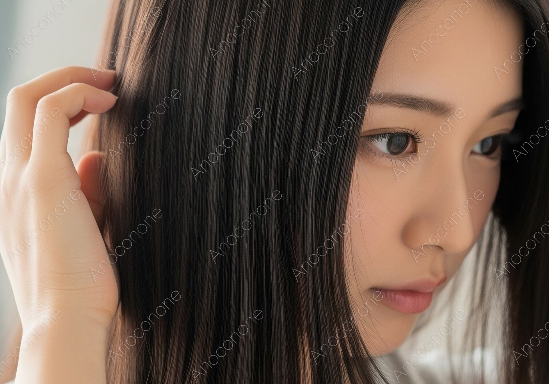 画像素材:明るい窓際で、自身の髪に両手を添えて丁寧に流れを整える女性の姿を捉えた高品質な一枚です。窓から差し込む柔らかな自然光が、髪の滑らかな質感と肌の透明感を美しく引き立て、清潔感あふれる上品な雰囲気を演出しています。落ち着いた表情で自分の髪と向き合う仕草は、日々のセルフケアを大切にする丁寧な暮らしを連想させ、見る人に安心感と美意識の高さを感じさせます。高精細な描写により、光を受けた髪の繊細な輝きや室内の穏やかな空気感まで見事に再現されており、非常にリアリティのある仕上がりです。ヘアケア製品の広告ビジュアル、美容サロンのプロモーション、あるいは健康的なライフスタイルを提案するメディアの素材として、ターゲット層の共感と信頼を得るのに最適な画像です。