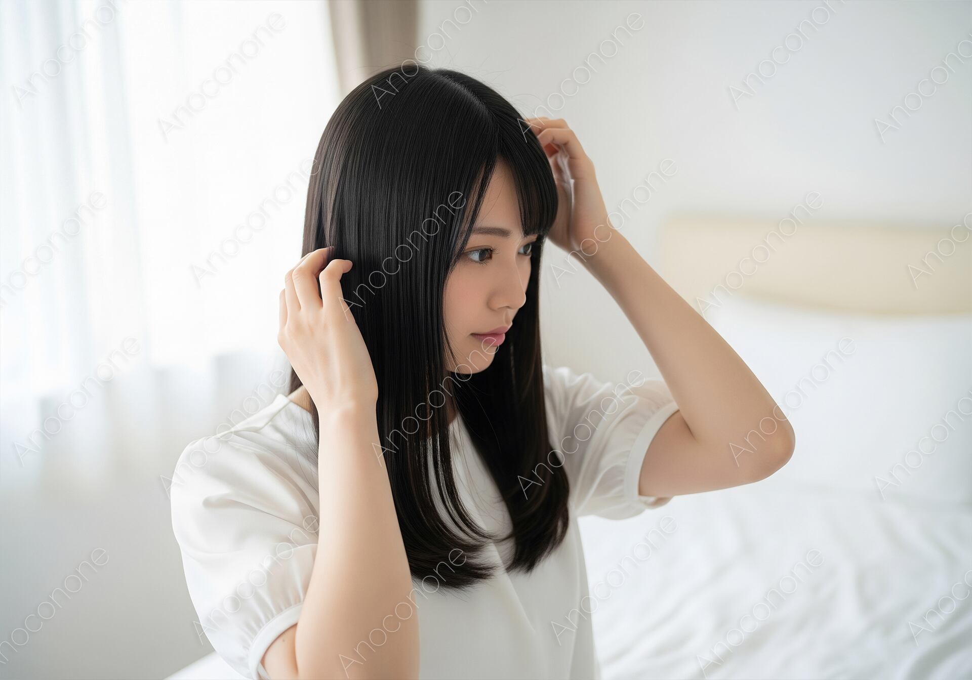 画像素材:明るく清潔感のある室内で、艶やかなロングヘアを両手で優しく整える女性の姿を捉えた高品質な一枚です。窓から差し込む柔らかな自然光が、真っ直ぐに伸びた黒髪の質感を美しく引き立て、透明感のある肌をより一層際立たせています。ふんわりとした白いパフスリーブのブラウスを身に纏い、静かに自分の髪と向き合う仕草は、見る人に上品で凛とした印象を与えます。高精細な描写により、髪の毛一本一本の繊細なラインや室内の穏やかな空気感まで見事に再現されており、リアリティ溢れる仕上がりとなっています。日常の何気ないセルフケアの瞬間を切り取ったこのビジュアルは、ヘアケア製品の広告、美容サロンのプロモーション、または丁寧な暮らしを提案するライフスタイルメディアの素材として、ターゲット層の目を引くのに最適です。