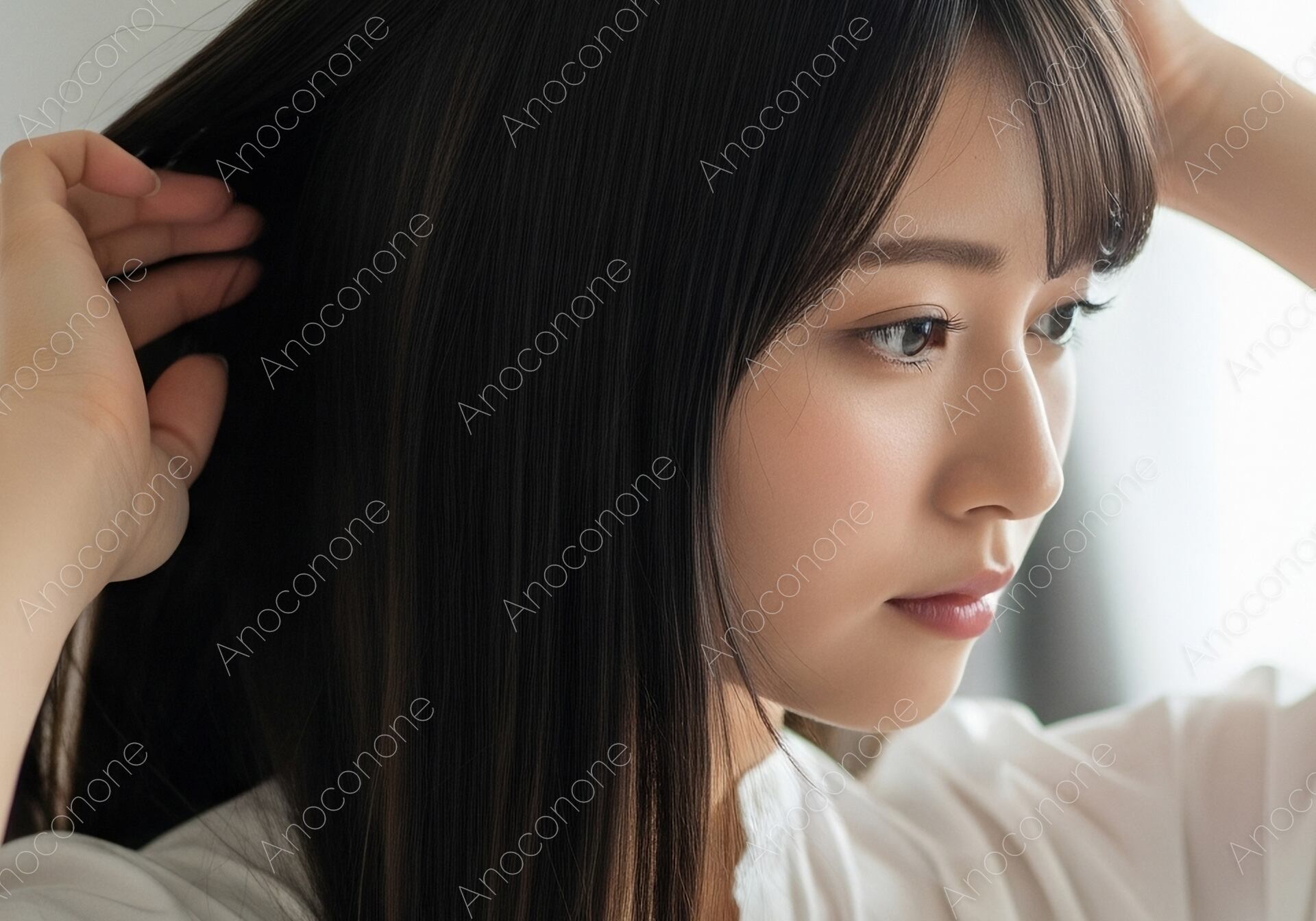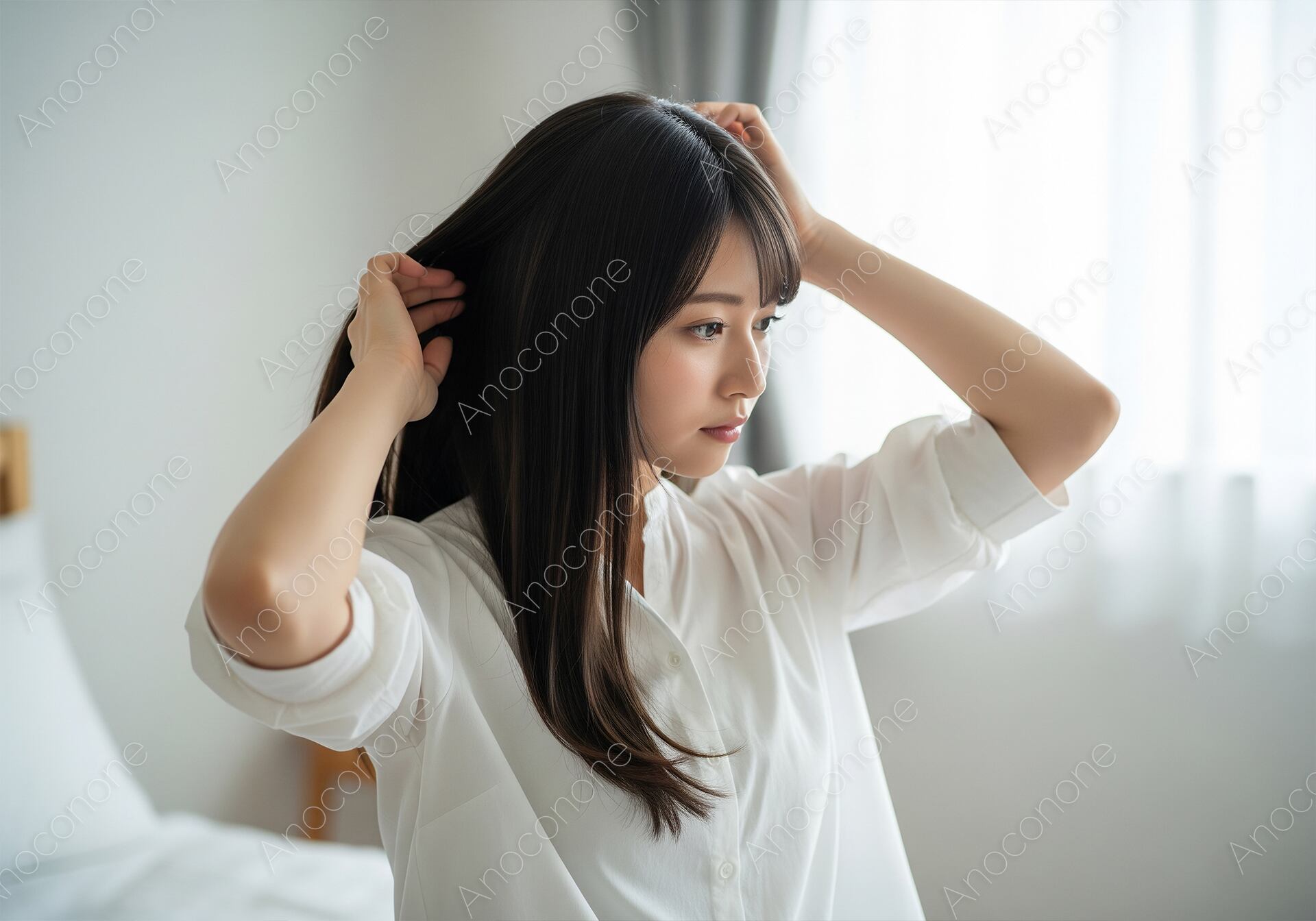 画像素材:窓から差し込む柔らかな自然光に包まれ、ベッドサイドでしなやかな黒髪をかき上げる女性の姿を捉えた一枚です。清潔感あふれる白シャツを身に纏い、ふとした瞬間の無防備さと凛とした美しさが共存する横顔が印象的です。さらさらとした髪の質感や、肌の透明感が繊細に表現されており、日常の何気ないシーンの中に潜む特別感を演出しています。落ち着いたトーンの背景が被写体を引き立て、見る人に安らぎと清潔な印象を与えます。美容系のコラム、ヘアケア製品のプロモーション、またはライフスタイルをテーマにしたウェブサイトのメインビジュアルをお探しの方に最適な素材です。