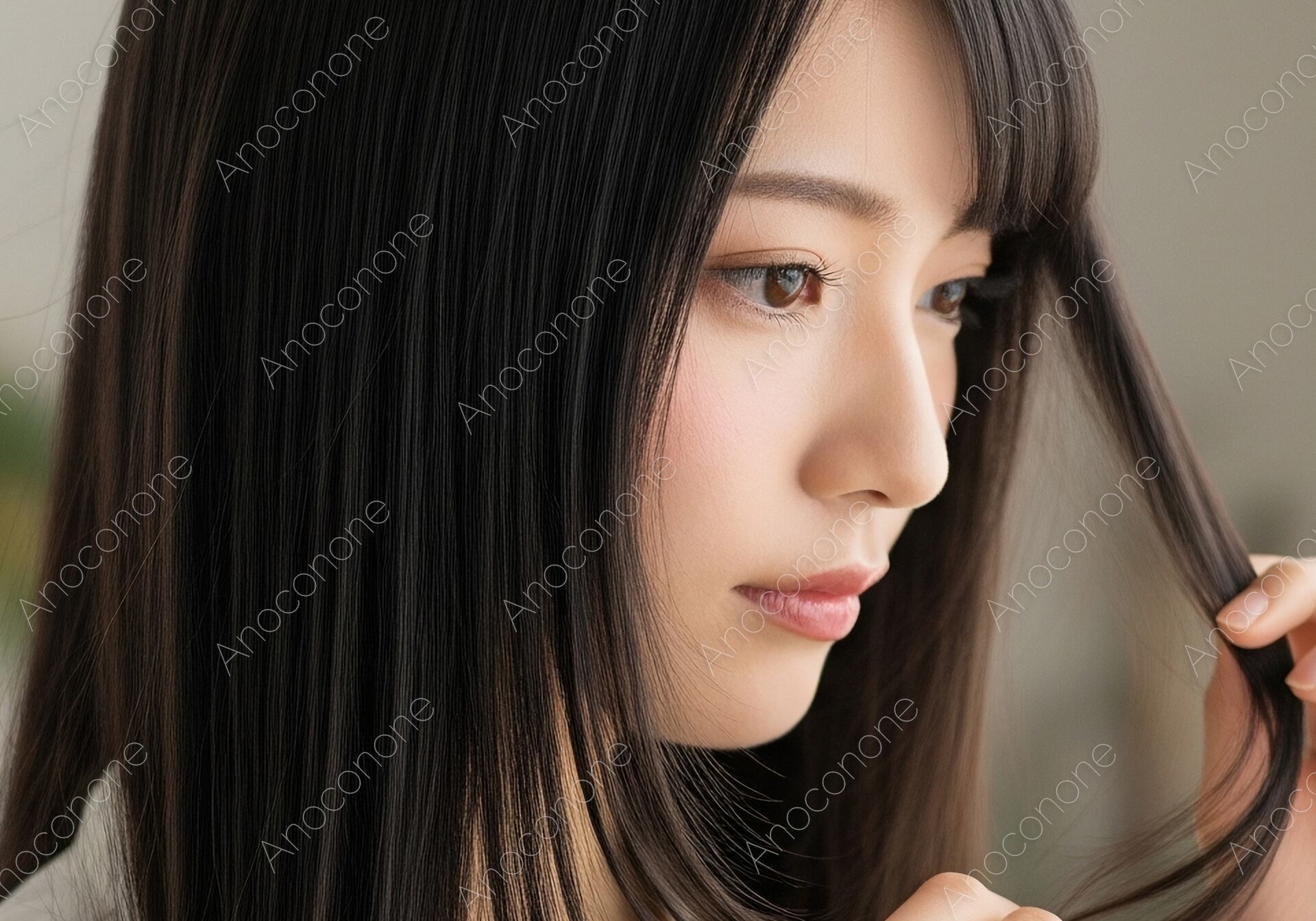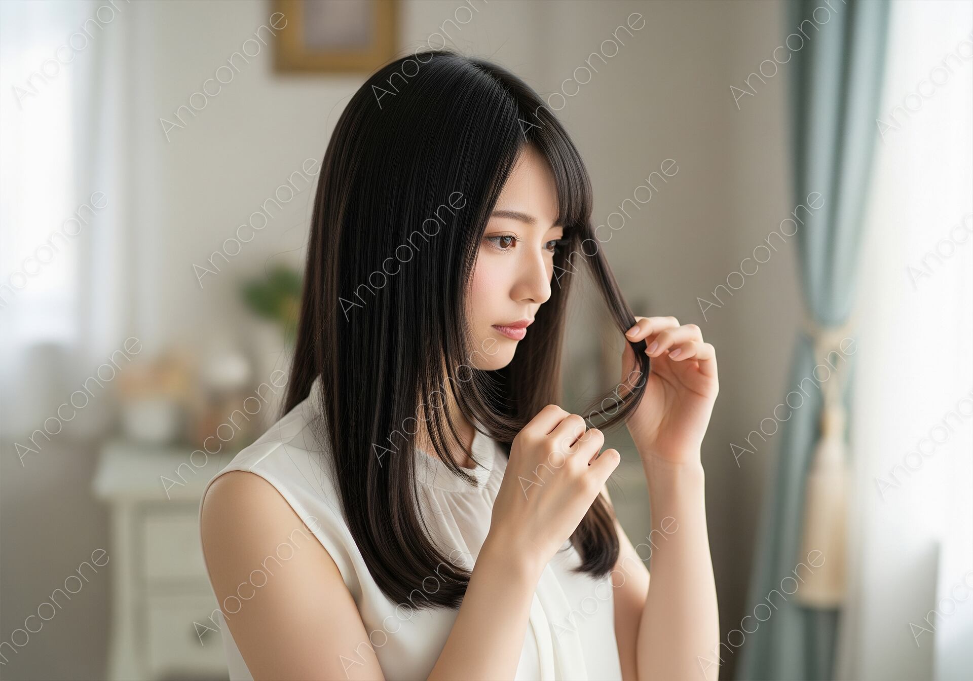 画像素材:清潔感あふれる明るい室内で、自身の髪の状態を真剣な眼差しでチェックする女性の姿を捉えた高品質なショットです。美しく整えられた黒髪のストレートヘアが、窓からの柔らかな光を受けて自然な艶を放っています。指先で毛先を優しくつまみ、日々のケアに関心を寄せる日常のひとコマを、落ち着いたトーンと繊細な描写で表現しました。美容関連のメディアやヘアケア製品のプロモーション、自分磨きをテーマにしたコンテンツに最適な、美意識の高さを感じさせる一枚です。美容に関心の高い層へ向けた広告や、ヘアサロンのイメージ画像として非常に訴求力の高いビジュアルとなっています。