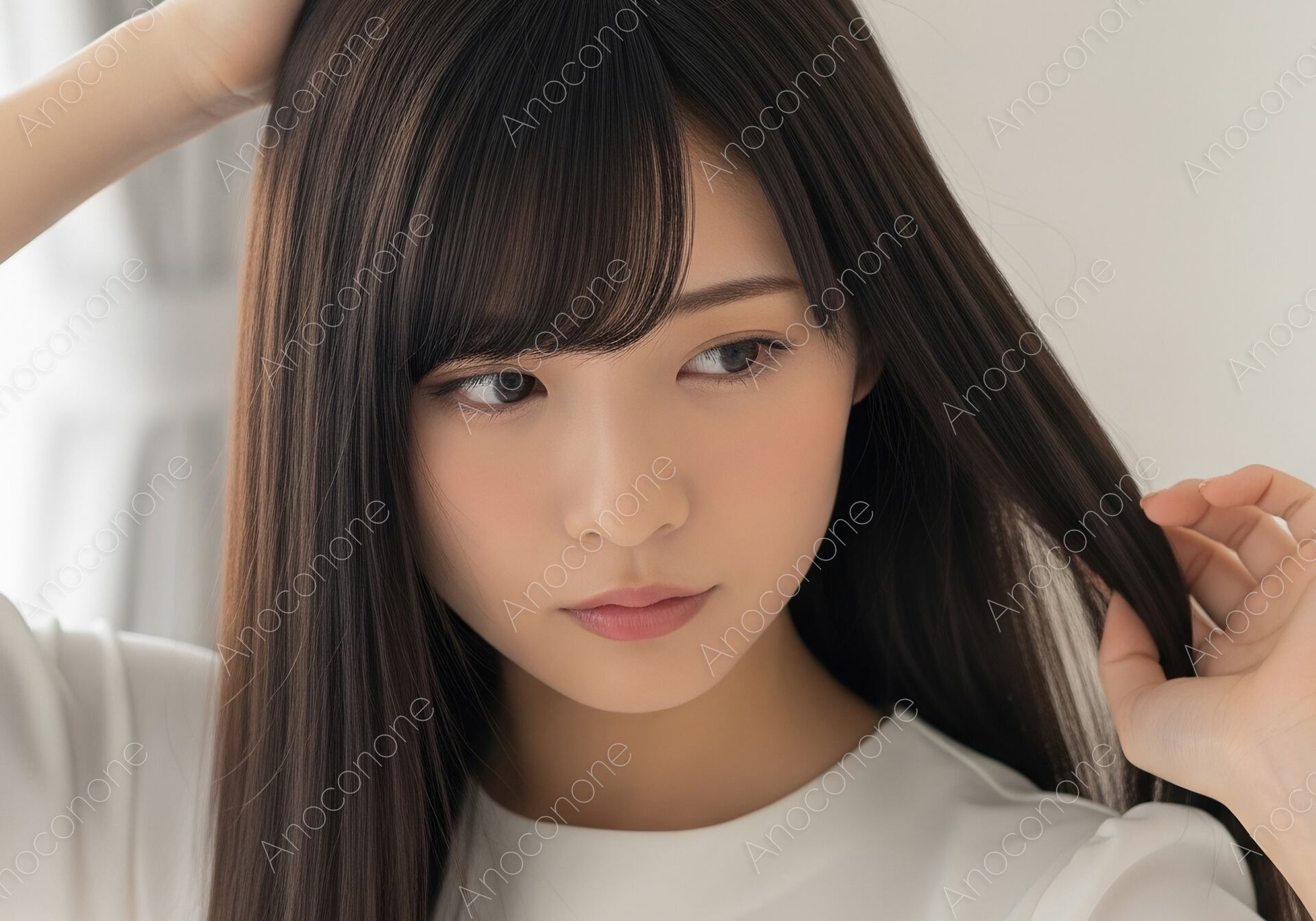 画像素材:明るく開放的な室内で、自身の長い黒髪を両手で優しく整える女性の姿を捉えた高品質な一枚です。窓から差し込む自然光が彼女の髪に美しい天使の輪を作り出し、健康的な艶とストレートのラインを強調しています。白を基調とした清潔感のある衣装と、落ち着いた表情が相まって、洗練された大人の美容習慣を感じさせる雰囲気に仕上がりました。日々のヘアケアや自分と向き合う丁寧な暮らしを象徴するビジュアルとして、ライフスタイル誌や美容関連の広告、SNSのアイキャッチなどに最適です。上質な美しさを求めるユーザーの視線を釘付けにする、訴求力の高い広告素材としてぜひご活用ください。