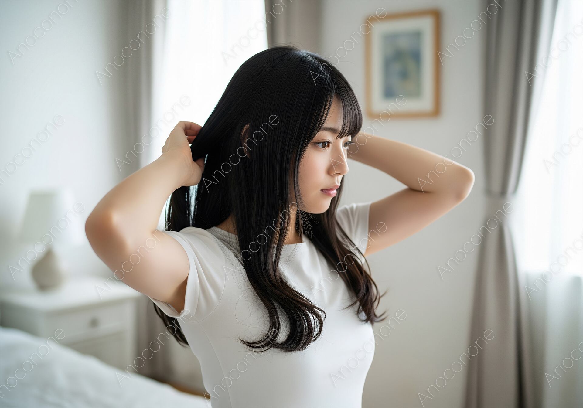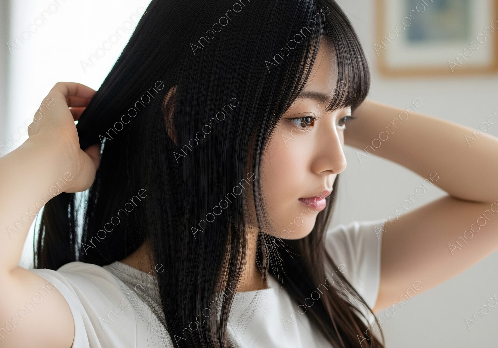 画像素材:明るく清潔感のある室内で、自身の長い黒髪を丁寧にまとめようとする女性の姿を捉えた高品質なショットです。真剣な眼差しで髪のバランスを整える横顔からは、日常の何気ない瞬間に宿る凛とした美しさが感じられます。白いTシャツを身に纏ったシンプルな装いが、彼女の艶やかな髪質と透明感のある肌をより一層引き立てています。窓からの柔らかな光が室内を満たし、健康的で穏やかな朝のルーティンを連想させる爽やかな雰囲気に仕上がりました。ヘアケア製品の広告、美容コラムのアイキャッチ、または自分磨きをテーマにしたライフスタイルメディアに最適なビジュアルです。清潔感と上品さを兼ね備えた画像をお探しのクリエイターや広告担当者様に強くおすすめしたい一枚となっています。