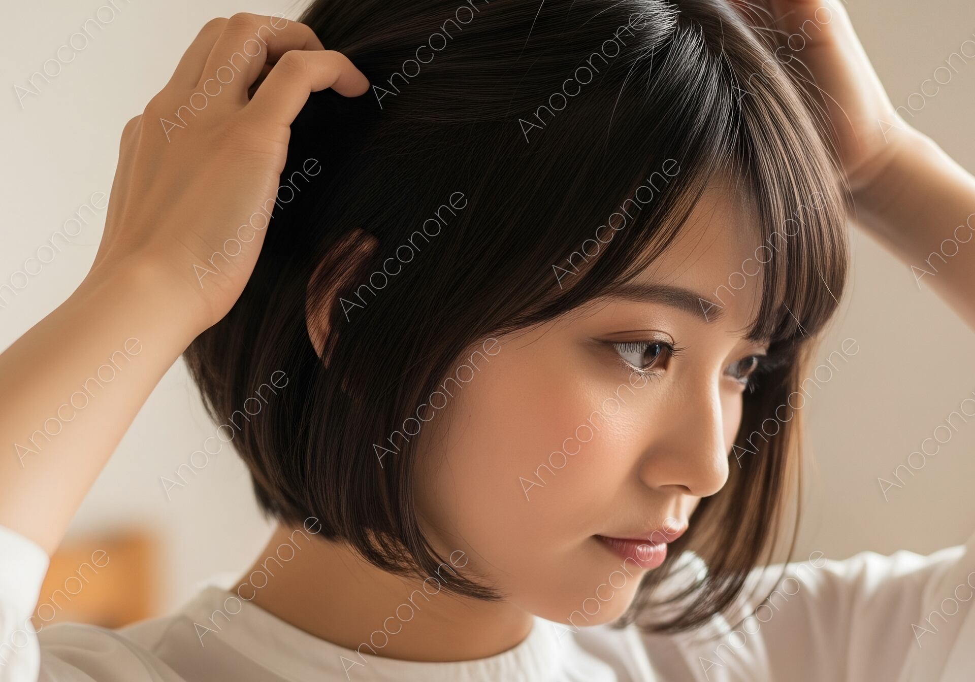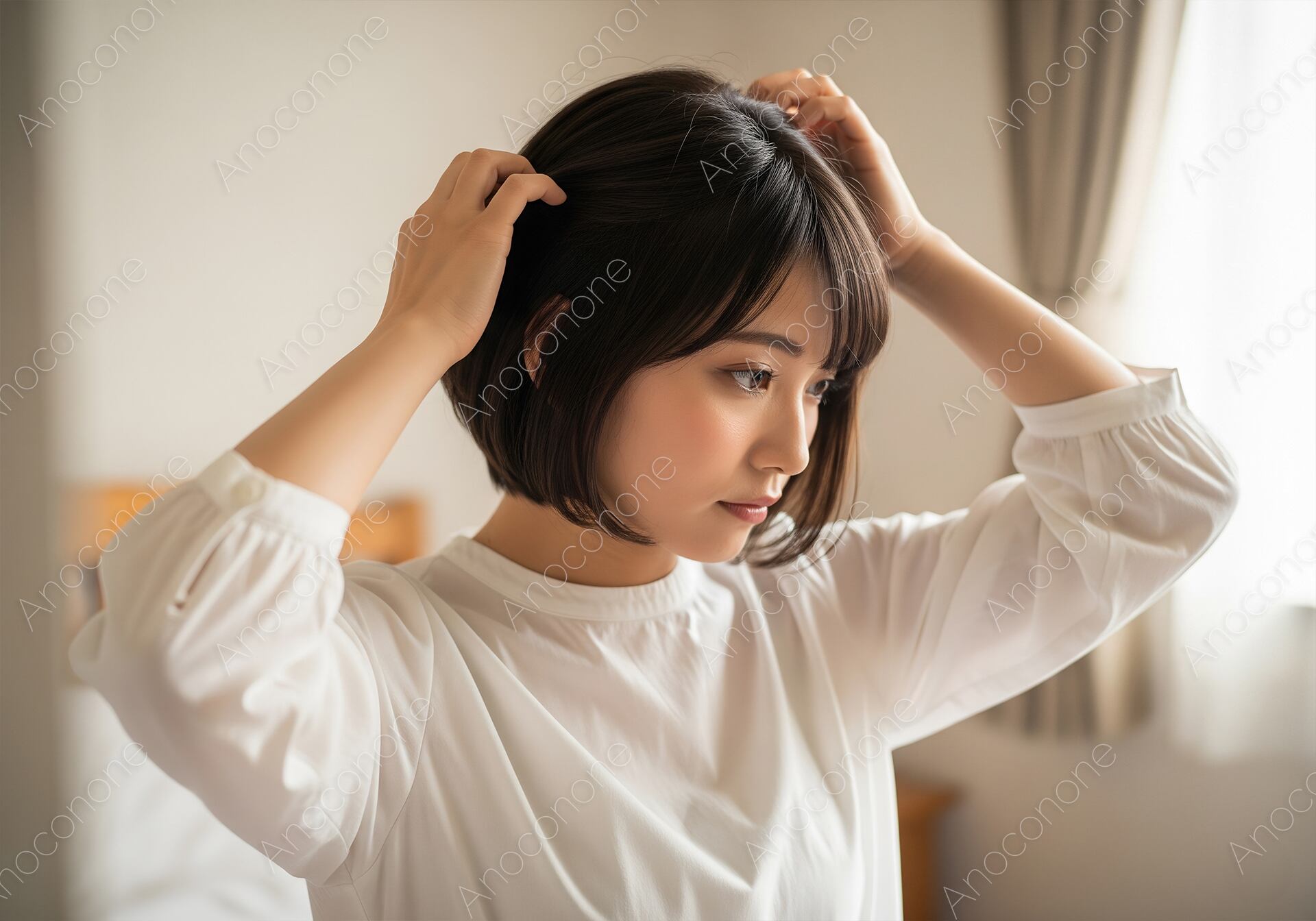 画像素材:清潔感あふれる明るい室内で、自身のショートボブを両手でふんわりと整える女性の姿を捉えた高品質な一枚です。指先でトップのボリュームを調整しながら、ヘアスタイルを完璧に仕上げようとする真剣な眼差しが、日常の何気ない瞬間に宿る美しさを際立たせています。窓からの柔らかな光が彼女を優しく包み込み、健康的な肌の質感と、丁寧に手入れされた髪の艶をより一層魅力的に演出しています。朝の準備シーンや自分磨きのルーティンをテーマにしたライフスタイルメディア、美容関連の広告、またはヘアサロンのイメージビジュアルなどに最適です。自然体でありながら洗練された大人の美容意識を表現したいプロジェクトにおいて、非常に高い訴求力を持つ広告素材となっています。