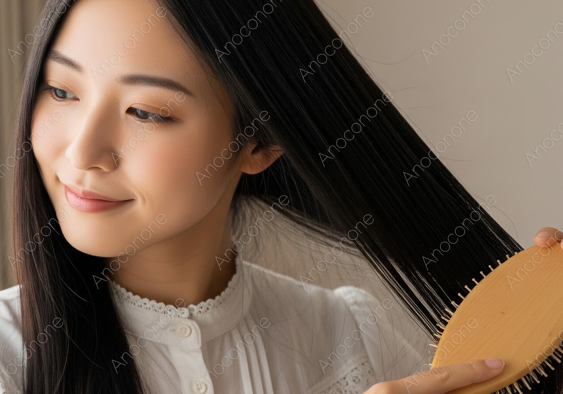 画像素材:窓から差し込む穏やかな自然光の中で、木製のヘアブラシを使って長い黒髪を丁寧にブラッシングする女性の姿を捉えた高品質な一枚です。ブラシが滑らかに髪を通る様子と、彼女の満足げで柔らかな微笑みが、日々のセルフケアを大切にする丁寧な暮らしを象徴しています。白を基調としたレースの装いが、彼女の持つ透明感と上品な美しさをより一層引き立て、清潔感あふれるビジュアルに仕上がりました。ヘアケア製品の広告や、モーニングルーティンをテーマにしたライフスタイルメディア、美容関連のSNSコンテンツのメインビジュアルに最適です。自分を慈しむ上質な時間をイメージさせるこの画像は、美意識の高い層へのブランド訴求に非常に効果的な素材となっています。
