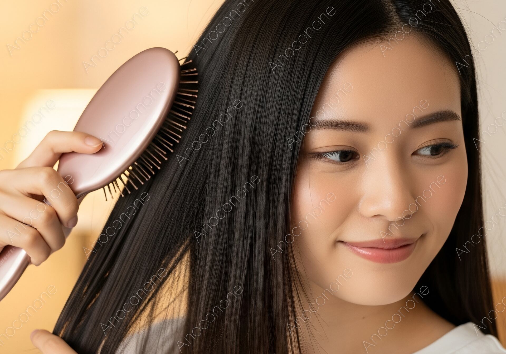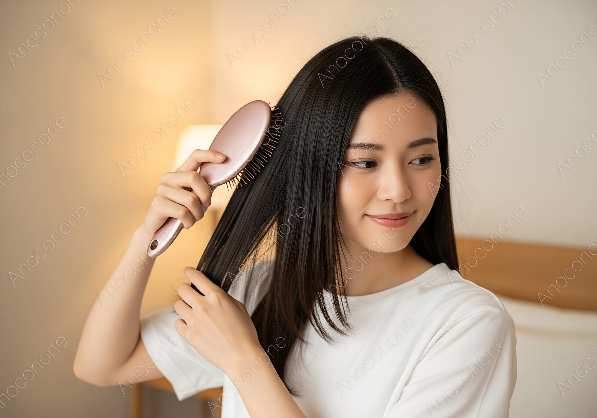 画像素材:温かみのある間接照明に照らされた室内で、ピンク色のヘアブラシを使い、自身の長い黒髪を丁寧にブラッシングする女性の姿を捉えた高品質な一枚です。ブラシを滑らせるたびに際立つ髪の自然な輝きと、彼女の穏やかで満足げな表情が、日々のセルフケアを大切にする丁寧な暮らしを演出しています。白を基調としたシンプルな装いが、黒髪の美しさと透明感のある肌をより一層引き立て、清潔感あふれる上品なビジュアルに仕上がりました。ヘアケア製品の広告や、おやすみ前のルーティンをテーマにしたライフスタイルメディア、美容関連のSNSコンテンツに最適です。自分を慈しむ上質な時間をイメージさせるこの画像は、美意識の高い層へのブランド訴求に非常に効果的な素材となっています。