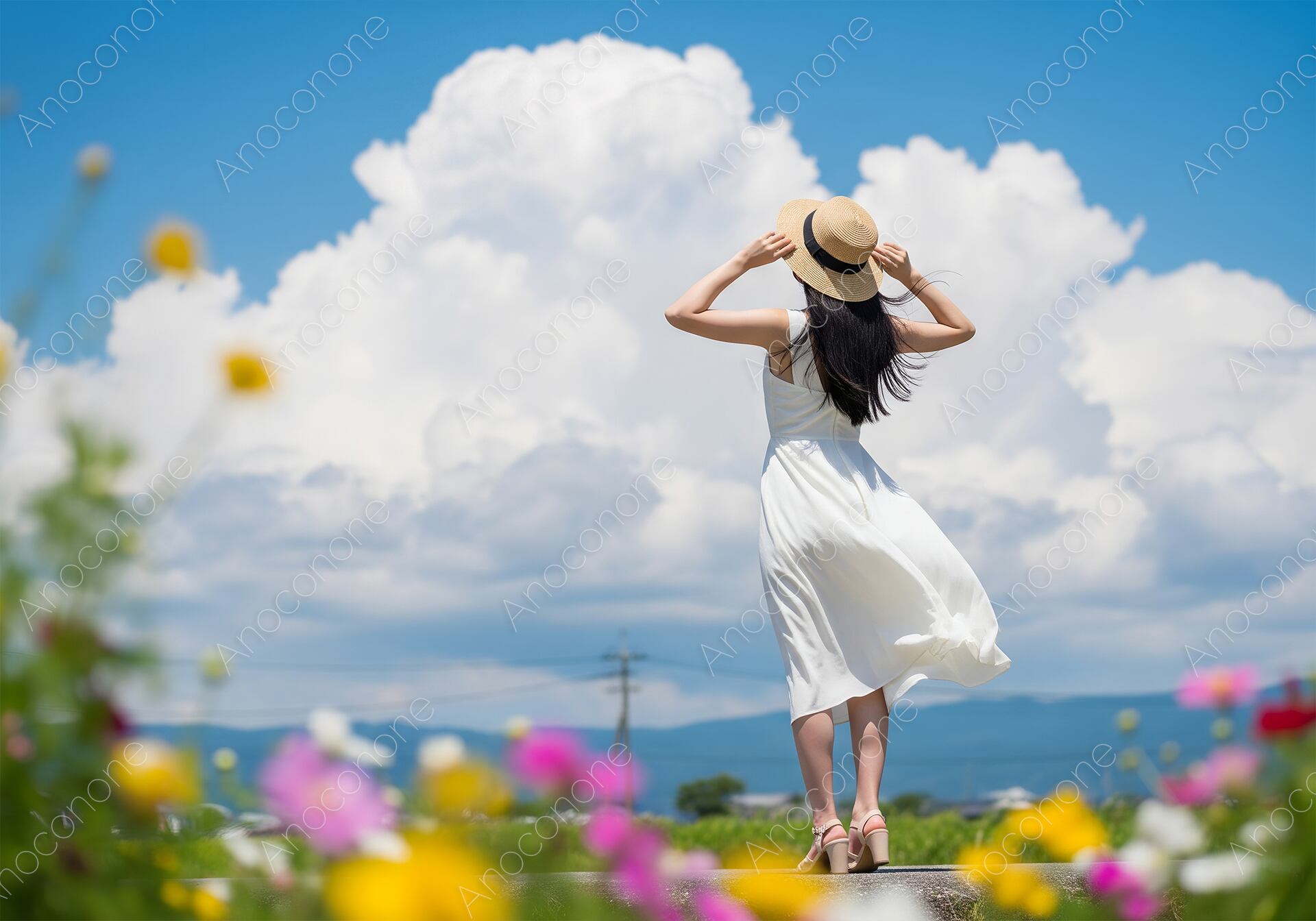 画像素材:鮮やかな青空に大きな入道雲が広がる夏の日、色とりどりの花が咲き誇る野原に立つ女性の後ろ姿を捉えた高品質なショットです。風に揺れる白いワンピースと麦わら帽子が、爽やかでノスタルジックな日本の夏を象徴しています。手前にはボケ味を活かしたコスモスが配され、奥行きのある美しい風景を作り出しています。夏休み、国内旅行、リゾート観光のプロモーション、または清涼感のあるライフスタイルをテーマにした広告やWebサイトのメインビジュアルに最適です。見る人に開放感と旅への高揚感を与える、物語性の高い一枚となっています。