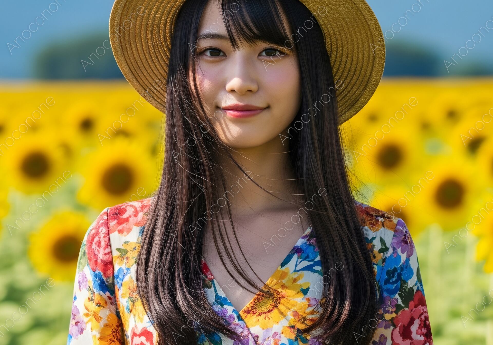 画像素材:見渡す限り広がる満開のひまわり畑の中心で、カメラに向かって優しく微笑む女性を捉えた高品質なショットです。鮮やかな黄色いひまわりと、彼女が身に纏うカラフルな花柄のワンピースが、夏のエネルギーと華やかさを完璧に表現しています。背景に広がる青い山並みとボケ味を活かした描写が、広大な自然の奥行きを感じさせます。夏休みの観光プロモーション、国内旅行のパンフレット、季節感のある広告、またはポジティブで明るいライフスタイルをテーマにしたWebサイトのメインビジュアルに最適です。見る人に元気と癒やしを与える、夏を象徴する魅力的な一枚となっています。