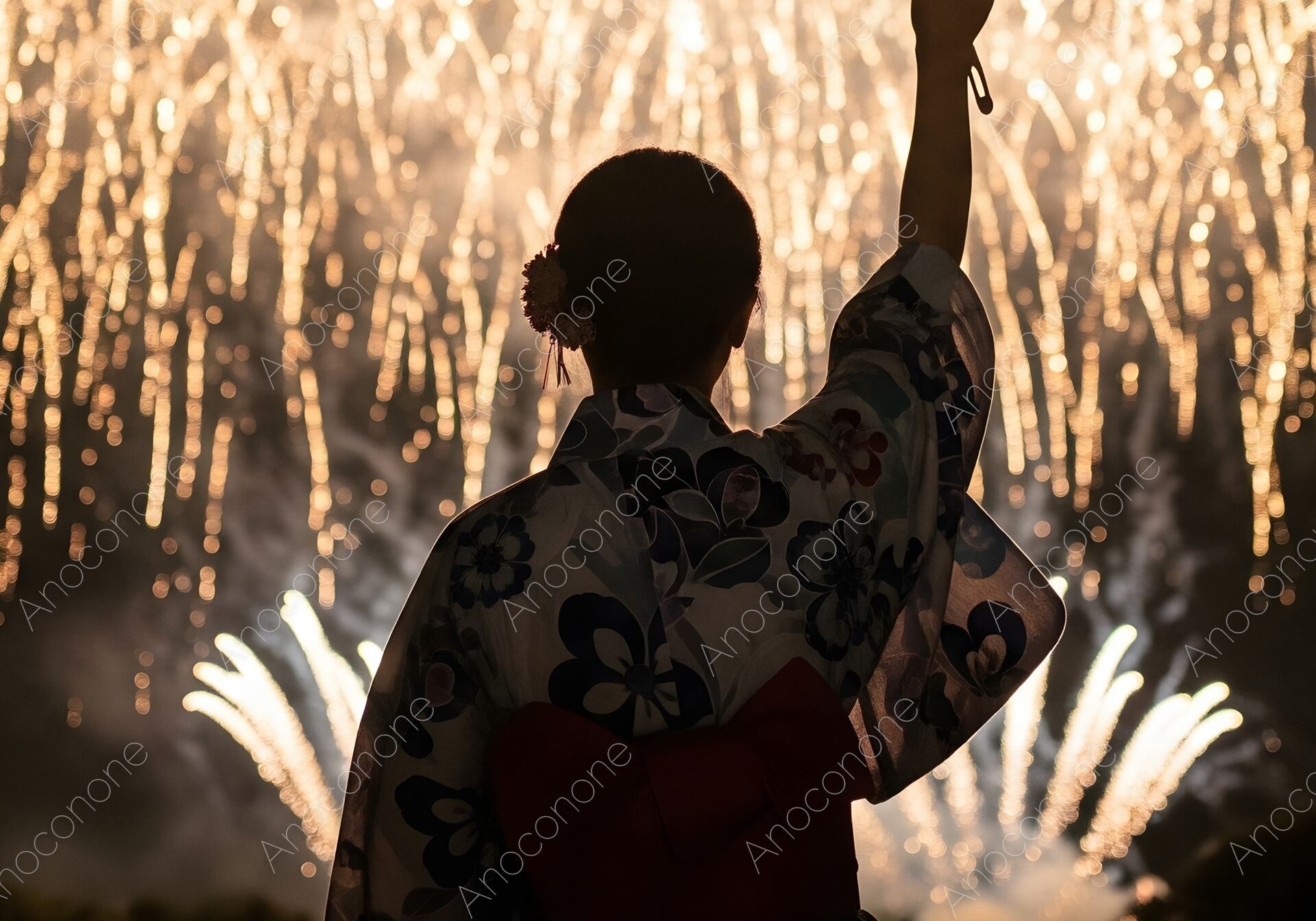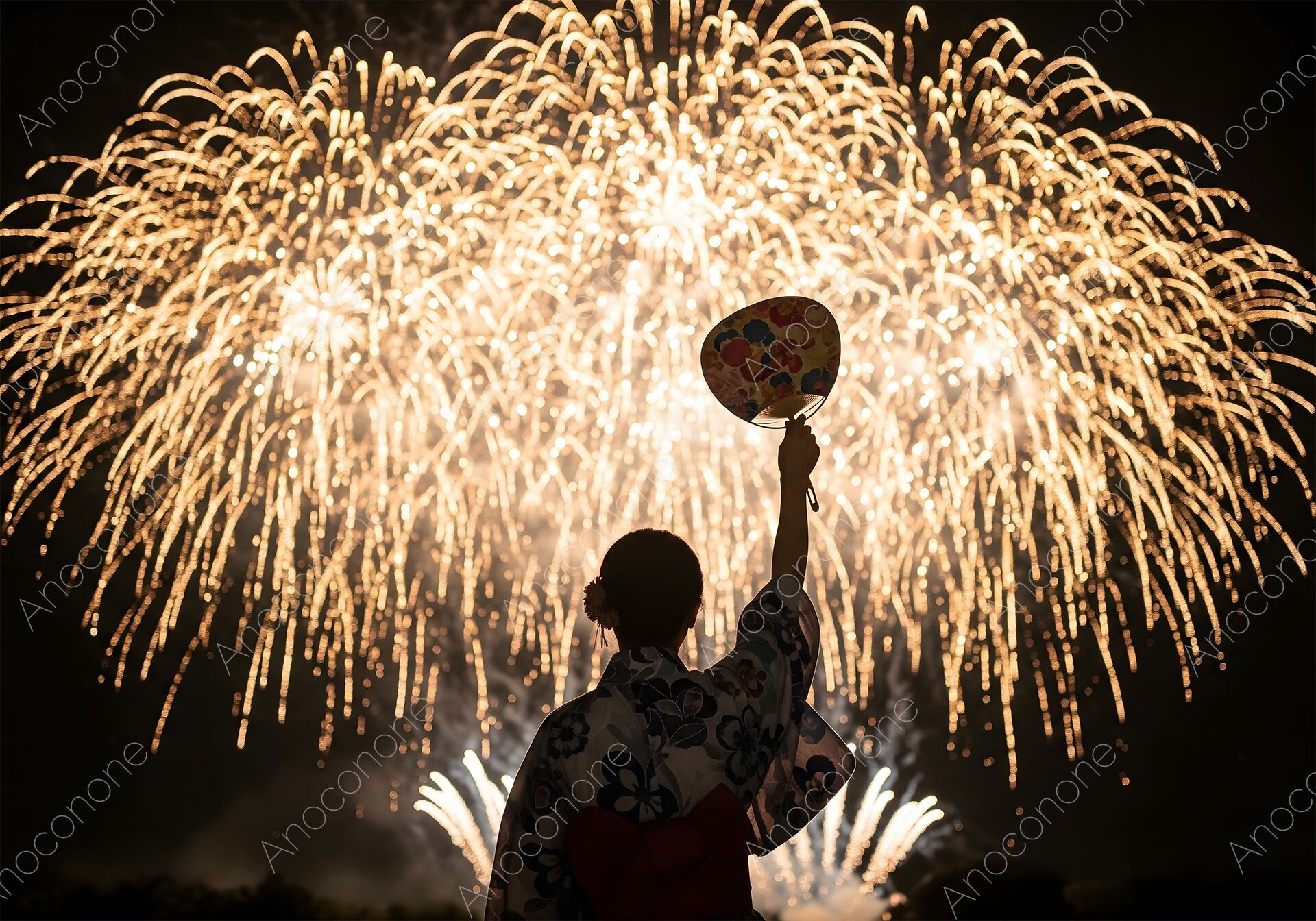 画像素材:漆黒の夜空を黄金色に染め上げる巨大な打ち上げ花火と、それを仰ぎ見る浴衣姿の女性の後ろ姿を捉えた、圧倒的な臨場感を持つ高品質なショットです。高く掲げられた「うちわ」が、花火の美しさに心躍らせる彼女の感動を象徴しています。夜空いっぱいに広がる光の粒子が、日本の夏の情緒を最大限に引き出し、物語のクライマックスのようなドラマチックな風景を作り出しています。夏休みのイベント告知、観光プロモーション、日本の文化を紹介するインバウンド向け広告、または「一生の思い出」をテーマにしたWebサイトのメインビジュアルに最適です。見る人の心を一瞬で掴む、情緒豊かな最高の一枚となっています。