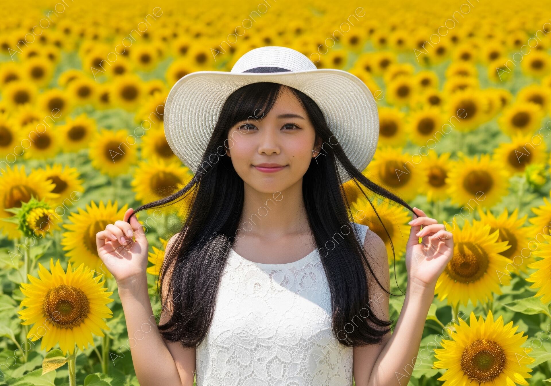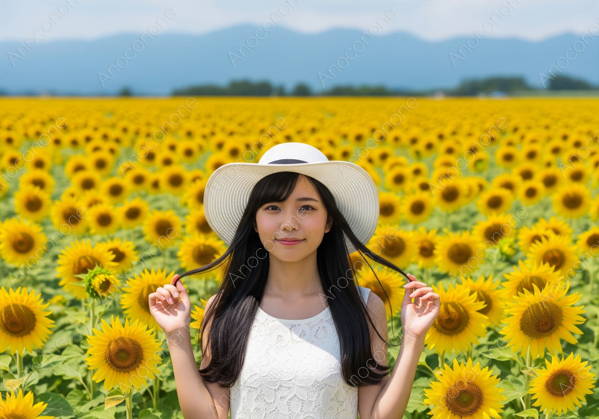 画像素材:見渡す限りに広がる満開のひまわり畑の中で、両手で髪を軽く持ち上げながら優しく微笑む女性を捉えた高品質なショットです。清潔感あふれる白いレースのワンピースと、大きな白い麦わら帽子が、真夏の太陽の下で眩しいほどの透明感を演出しています。背景に広がる青い山並みと、ボケ味を活かした無数のひまわりが、広大な自然の美しさと季節感を際立たせています。夏休みの観光プロモーション、国内旅行のパンフレット、スキンケアやアパレルの季節広告、またはポジティブなライフスタイルをテーマにしたWebサイトのメインビジュアルに最適です。見る人に夏の喜びと爽やかさを届ける、非常に魅力的な一枚となっています。