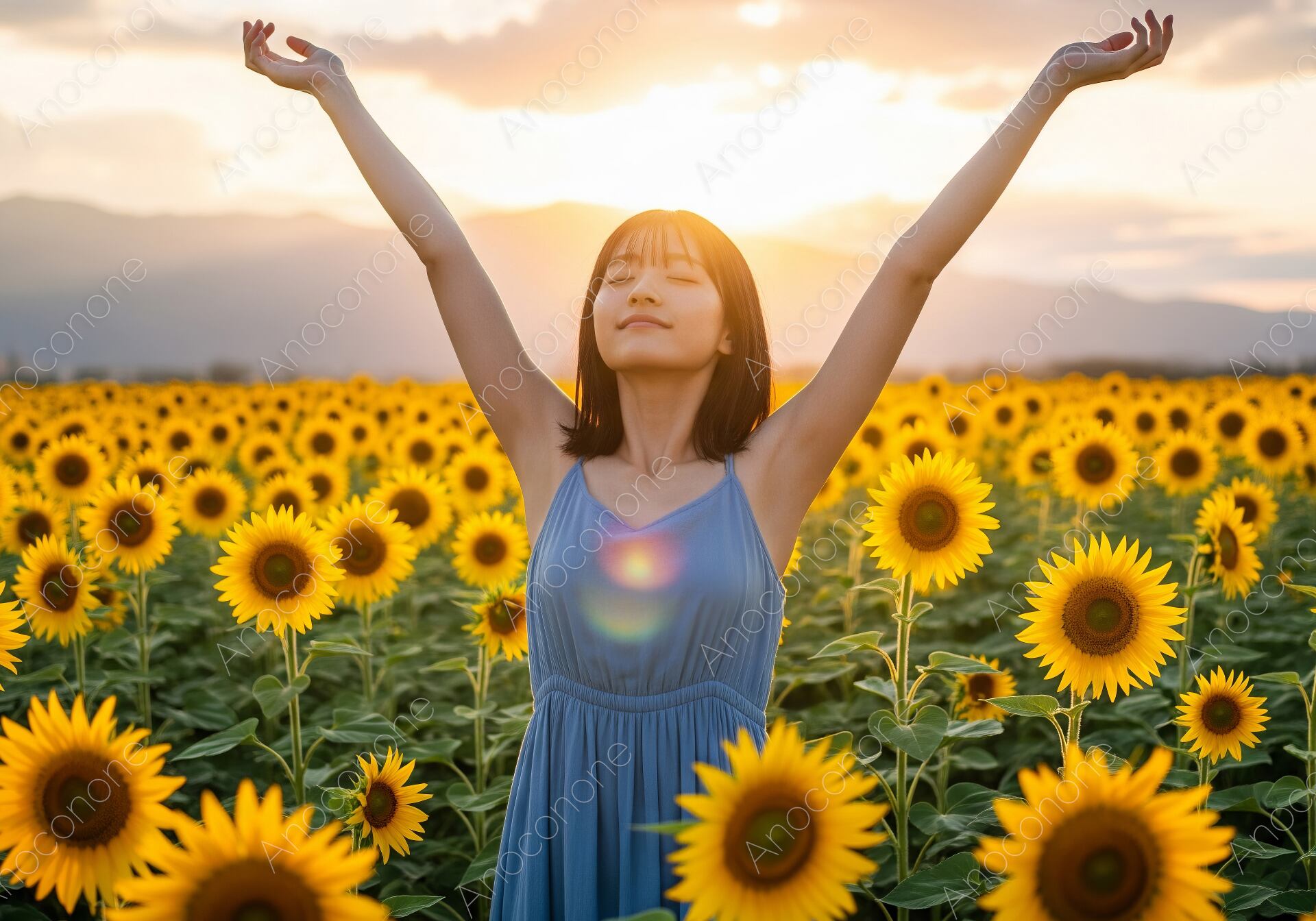 画像素材:地平線に沈む黄金色の夕日を背景に、満開のひまわり畑の中で両手を大きく広げ、心地よい風と光を感じている女性を捉えた高品質なショットです。柔らかな夕陽に照らされた彼女の穏やかな表情と、鮮やかなブルーのワンピースが、夏の終わりのドラマチックでエモーショナルな瞬間を美しく演出しています。オレンジ色に染まる空と大輪のひまわりが織りなす絶景は、見る人に深い感動とリフレッシュした気分を与えます。夏休みの旅行、観光プロモーション、ヒーリングやマインドフルネスをテーマにした広告、または自由でポジティブなメッセージを伝えるWebサイトのメインビジュアルに最適です。一瞬の輝きを切り取った、非常にストーリー性の高い一枚となっています。