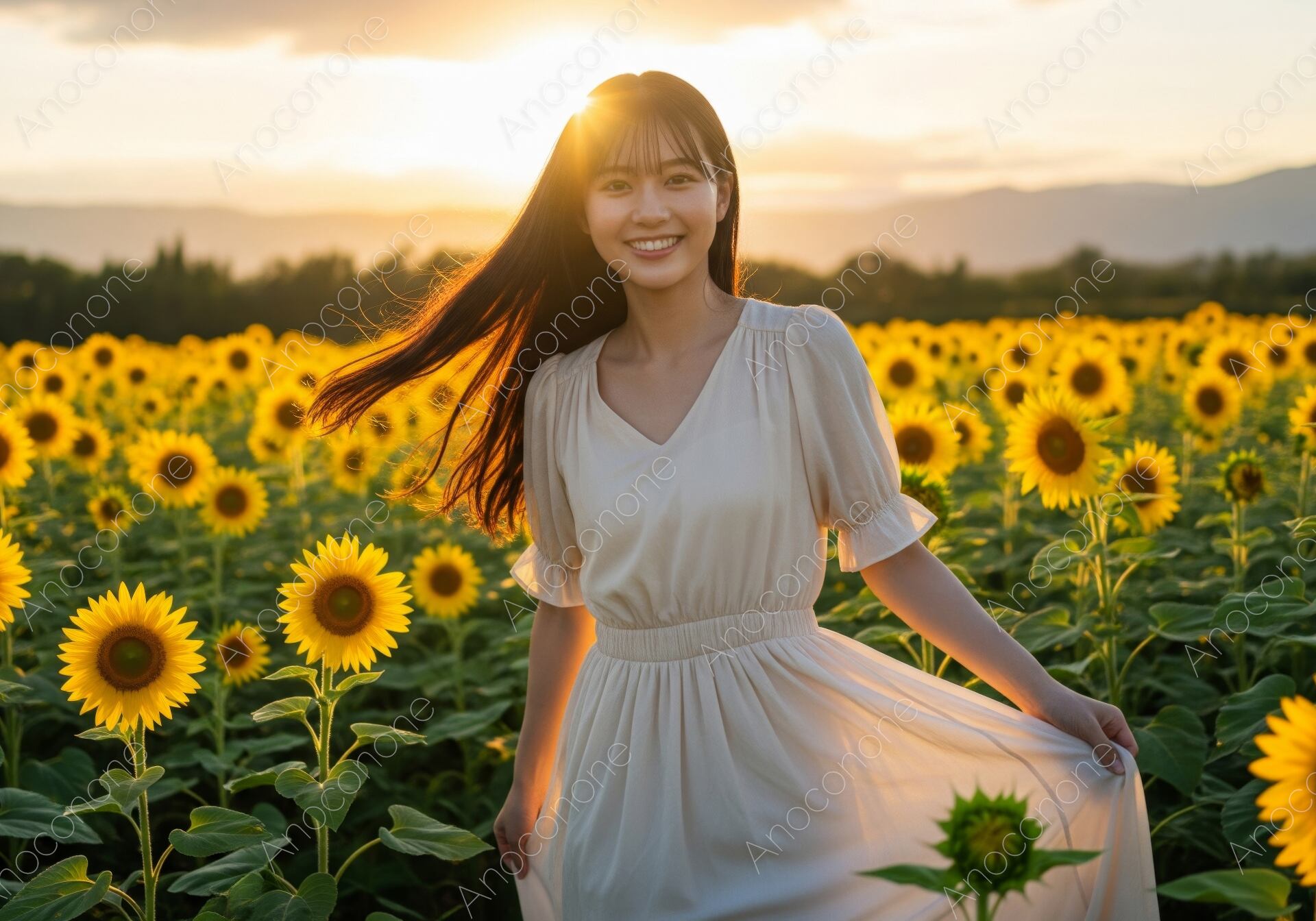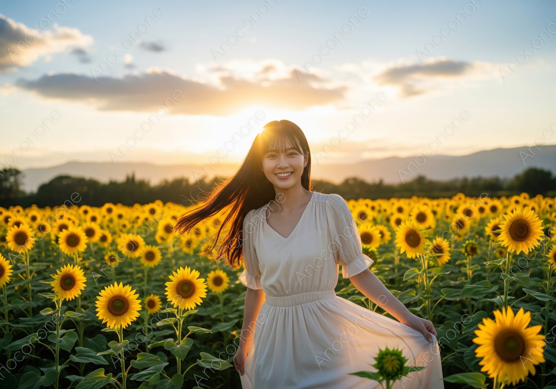 画像素材:黄金色に染まる夕陽を背景に、満開のひまわり畑の中を軽やかに歩く女性を捉えた高品質なショットです。逆光に透ける長い髪と、ふんわりと広がった白いワンピースが、夏の終わりのノスタルジックで美しい一瞬を演出しています。彼女の晴れやかな笑顔と、どこまでも続くひまわりの黄色、そして遠くに霞む山並みが織りなす構図は、見る人に圧倒的な開放感と幸福感を与えます。夏休みの旅行、観光プロモーション、エモーショナルな季節の広告、またはポジティブなエネルギーを伝えるWebサイトのメインビジュアルに最適です。一筋の光が差し込むドラマチックなこの一枚は、美意識の高い層へ向けた訴求に非常に効果的です。