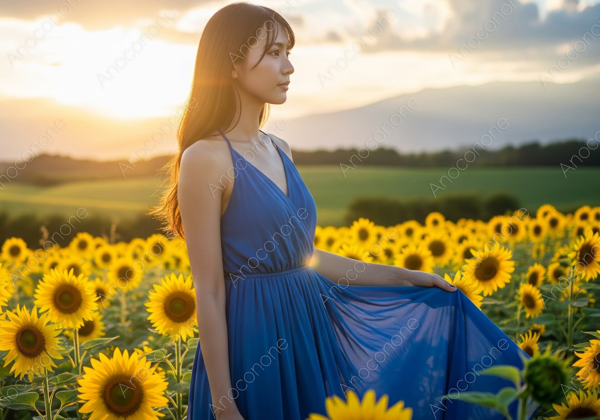 画像素材:地平線に沈む黄金色の夕日を背景に、満開のひまわり畑の中で遠くを見つめる女性を捉えた高品質なショットです。夕陽の光を浴びて輝く彼女の美しい横顔と、鮮やかなブルーのワンピースが、夏の終わりのドラマチックでエモーショナルな瞬間を演出しています。オレンジ色に染まる空と大輪のひまわり、そして遠くに広がる山並みが織りなす構図は、見る人に圧倒的な開放感と物語性を感じさせます。夏休みの旅行、観光プロモーション、エモーショナルな季節の広告、または洗練されたライフスタイルをテーマにしたWebサイトのメインビジュアルに最適です。一瞬の輝きを切り取った、非常にアイキャッチ効果の高い一枚となっています。