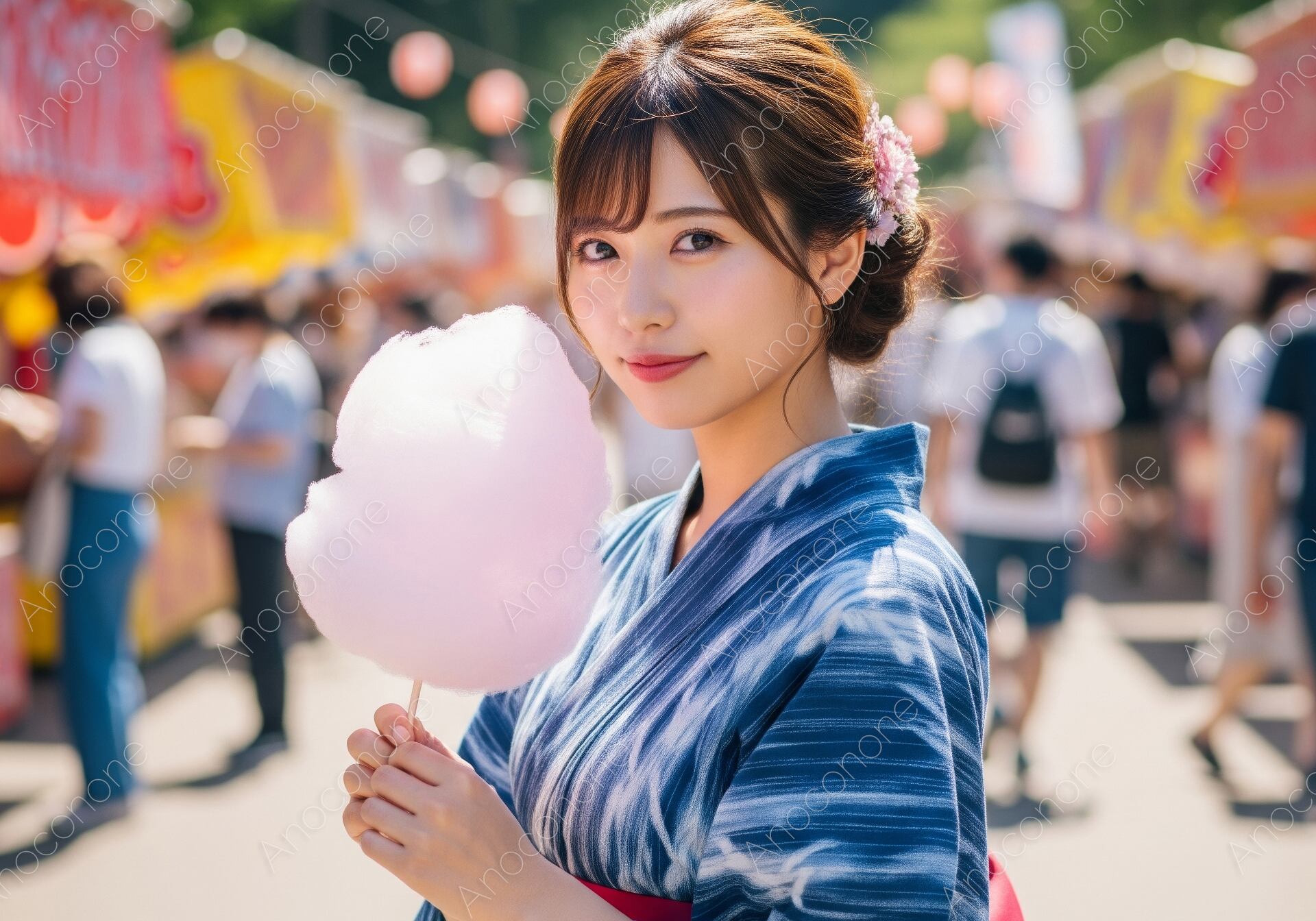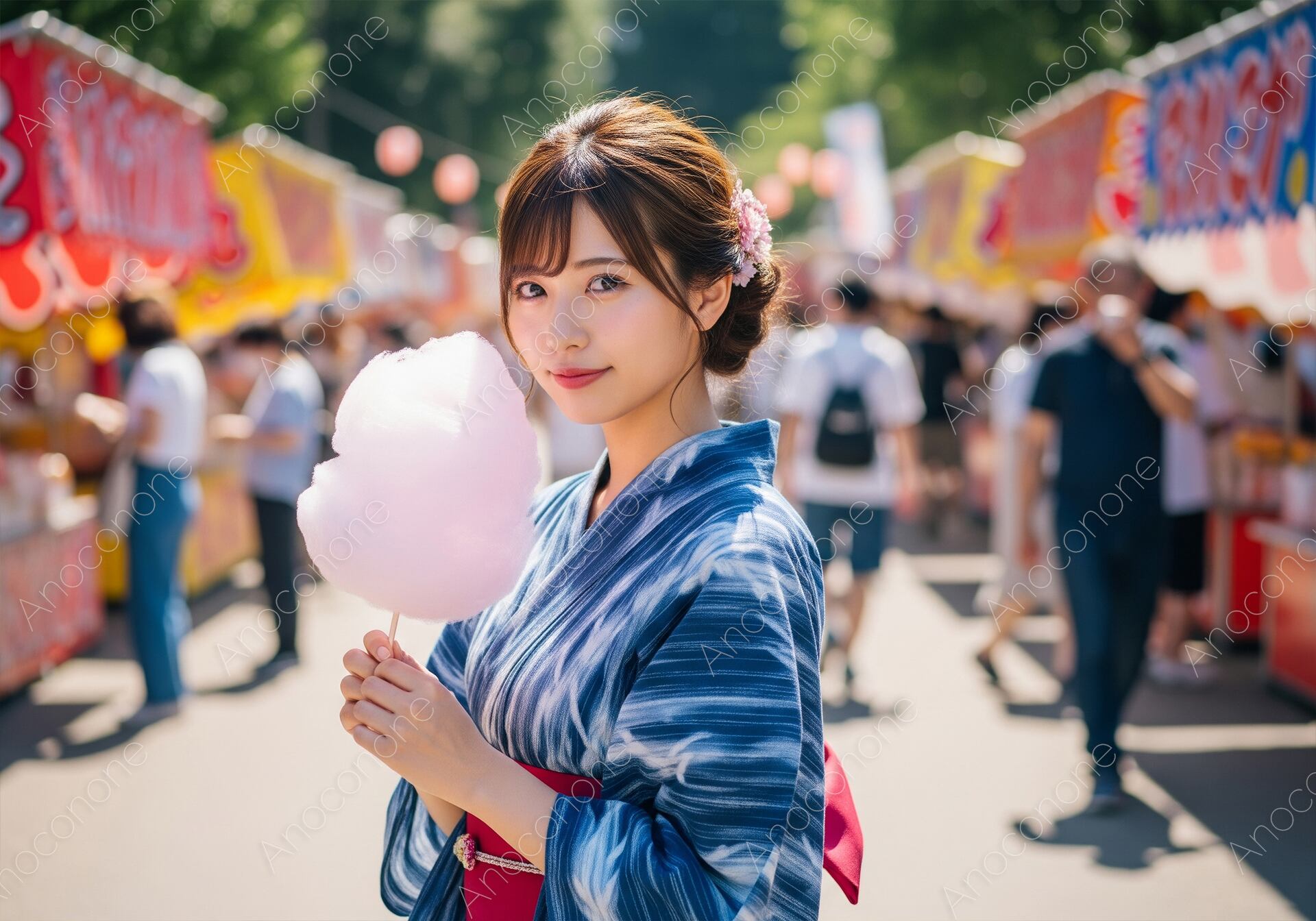 画像素材:活気あふれる夏祭りの縁日で、淡いピンクの綿菓子を手に持ち、優しく微笑む浴衣姿の女性を捉えた高品質なショットです。藍色の涼しげな浴衣と、きれいにまとめられたヘアスタイルが、日本の夏の情緒を美しく引き立てています。背景には色鮮やかな屋台が並び、ボケ味を活かした描写が、まるでお祭りの喧騒の中にいるような臨場感を演出しています。夏休みのイベント、観光プロモーション、和装・浴衣の広告、または日本の伝統文化をテーマにしたWebサイトのメインビジュアルなどに最適です。見る人に「日本の夏」の楽しさと懐かしさを感じさせる、非常に魅力的な一枚となっています。