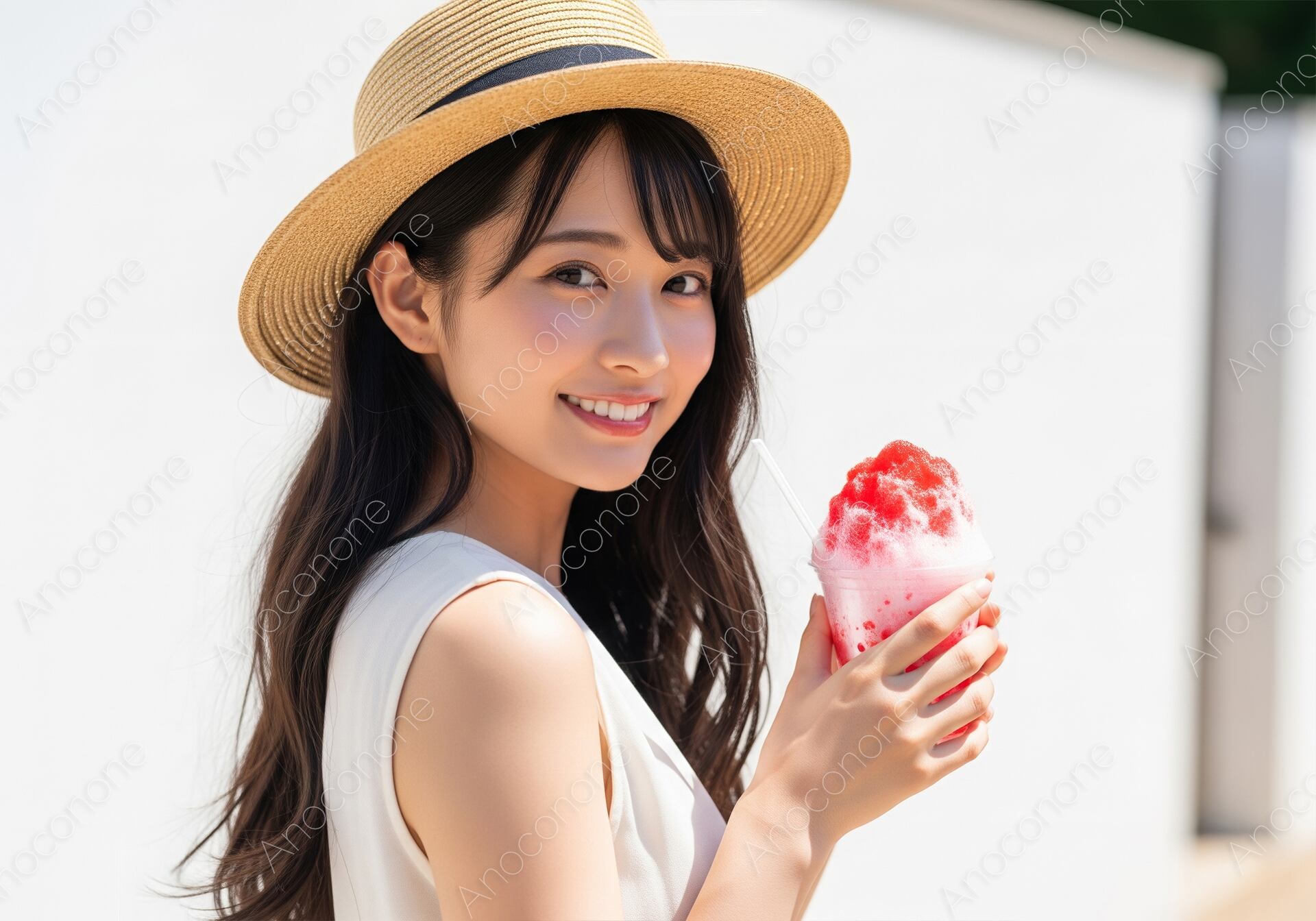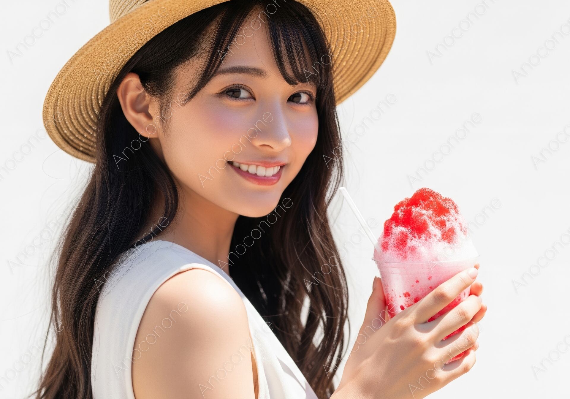 画像素材:抜けるような青空を連想させる白い背景の前で、真っ赤な苺シロップがたっぷりかかったかき氷を持つ女性の姿を捉えた一枚です。麦わら帽子を被り、涼しげな白いノースリーブを着た彼女の笑顔は、真夏の暑さを忘れさせてくれるような爽やかさに満ちています。氷の質感やシロップの鮮やかな発色が、見ているだけで喉を鳴らしたくなるような瑞々しさを表現しています。夏休みの旅行、お祭り、冷たいスイーツのプロモーションなど、季節感を前面に出したいデザインにぴったりです。この素材は、夏のキャンペーンを華やかに彩りたいWEB広告制作の方に特におすすめしたい高品質な一枚となっています。