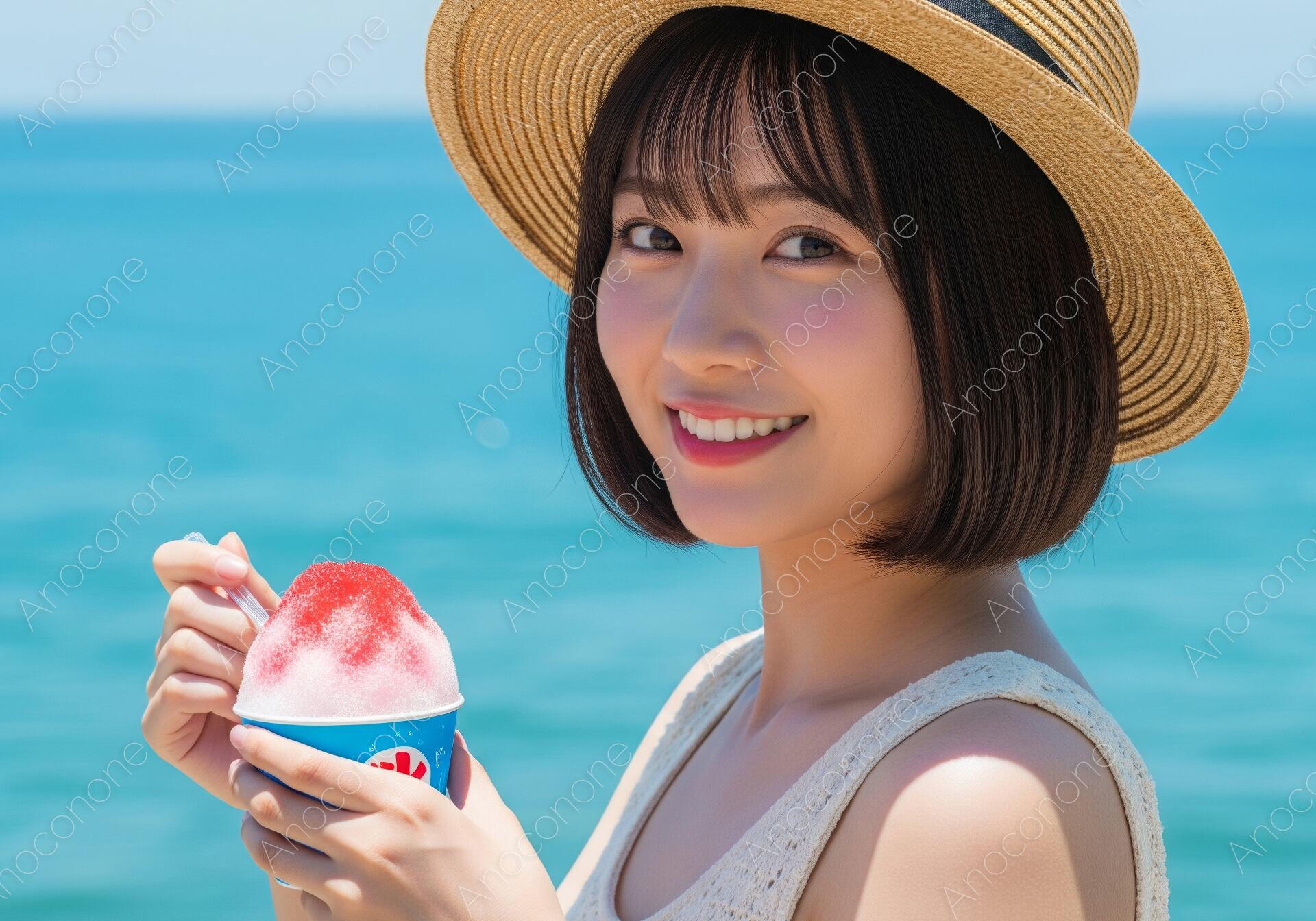 画像素材:見渡す限り広がる真っ青な海をバックに、涼しげな麦わら帽子を被った女性がイチゴのかき氷を楽しんでいる一コマです。夏の強い日差しを感じさせつつも、海風と冷たい氷の爽やかさが伝わってくるような開放感あふれる一枚に仕上がりました。女性の穏やかで可愛らしい笑顔と、手に持ったかき氷の鮮やかな赤色が、夏のレジャーの楽しさをより一層引き立てています。背景のブルーと手元の赤色のコントラストが非常に美しく、パッと目を引く視覚的な魅力があります。夏の旅行プランの紹介や、ビーチサイドでの飲食プロモーション、季節を感じさせるSNS投稿用の素材として最適です。