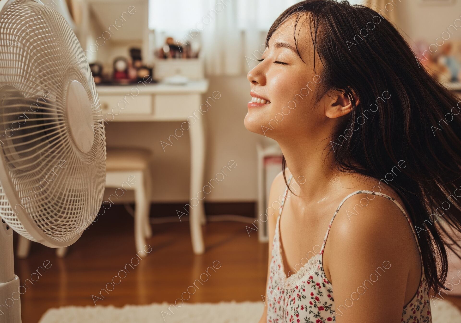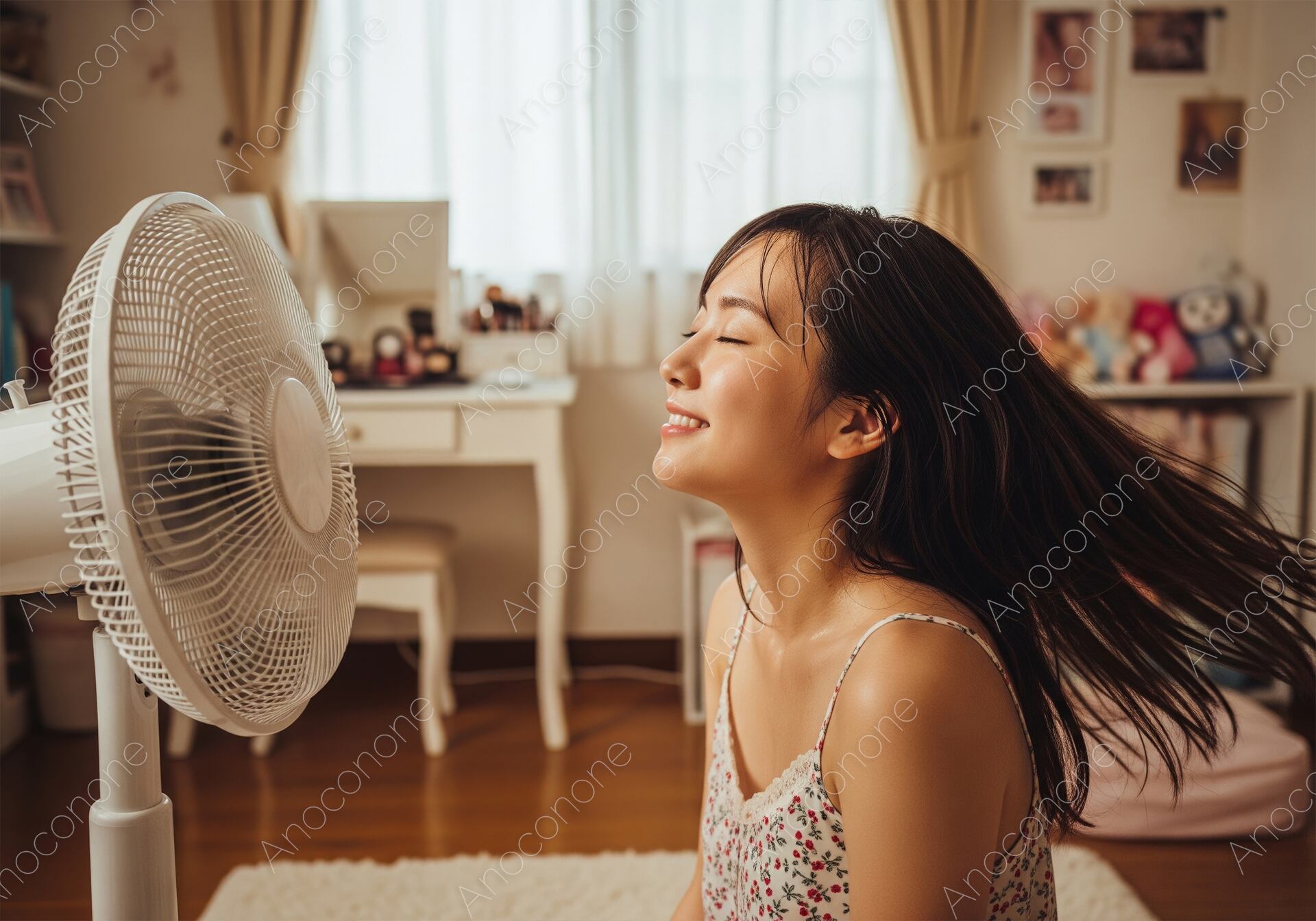 画像素材:お風呂上がりや暑い夏の昼下がり、室内で扇風機を回して心地よい風を全身で浴びる女性の日常を切り取った一枚です。風に髪がふわっとなびき、目を閉じて幸せそうに微笑む彼女の表情からは、火照った体が静かに冷えていく瞬間の解放感と安らぎがリアルに伝わってきます。柔らかい室内の照明が肌の質感を美しく見せ、飾り気のないキャミソール姿が健康的で親しみやすい雰囲気を醸し出しています。背景に映るドレッサーや小物が、等身大の暮らしを感じさせるリアリティを生んでおり、視聴者に高い共感を与える視覚効果があります。夏の暑さ対策や家電製品のプロモーション、リラックスタイムをテーマにした広告素材として非常に使いやすい内容です。日常の何気ない幸せや涼を求めるシーンを表現したいクリエイターの方に特におすすめします。