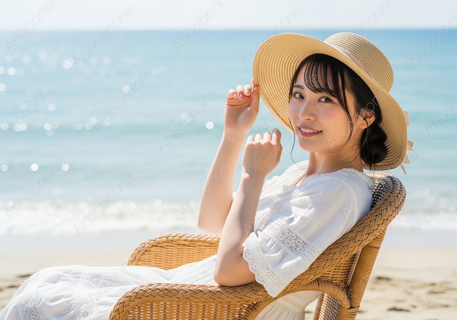 画像素材:どこまでも続く青い海と、太陽の光を受けてキラキラと輝く水面を背景に、砂浜に置かれたラタンチェアでくつろぐ女性を正面から捉えた一枚です。涼しげな白いワンピースに身を包み、大きな麦わら帽子にそっと手を添えながらこちらを見つめる彼女の笑顔は、夏の陽射しのように明るく健康的です。波打ち際から届く爽やかな潮風や、さらさらとした砂の感触まで伝わってくるような、臨場感あふれる描写が特徴となっています。抜けるような青空と白い雲、そして透明感のある海のコントラストが、見る人に開放的な気分とバカンスへの憧れを抱かせます。細部まで非常に高精細に表現されており、夏のレジャーや旅行広告、ライフスタイル提案のアイキャッチなど、幅広い用途で主役になれる高品質な写真素材です。季節感あふれる爽やかなビジュアルで、ターゲットの目を引くバナー制作などにぜひお役立てください。