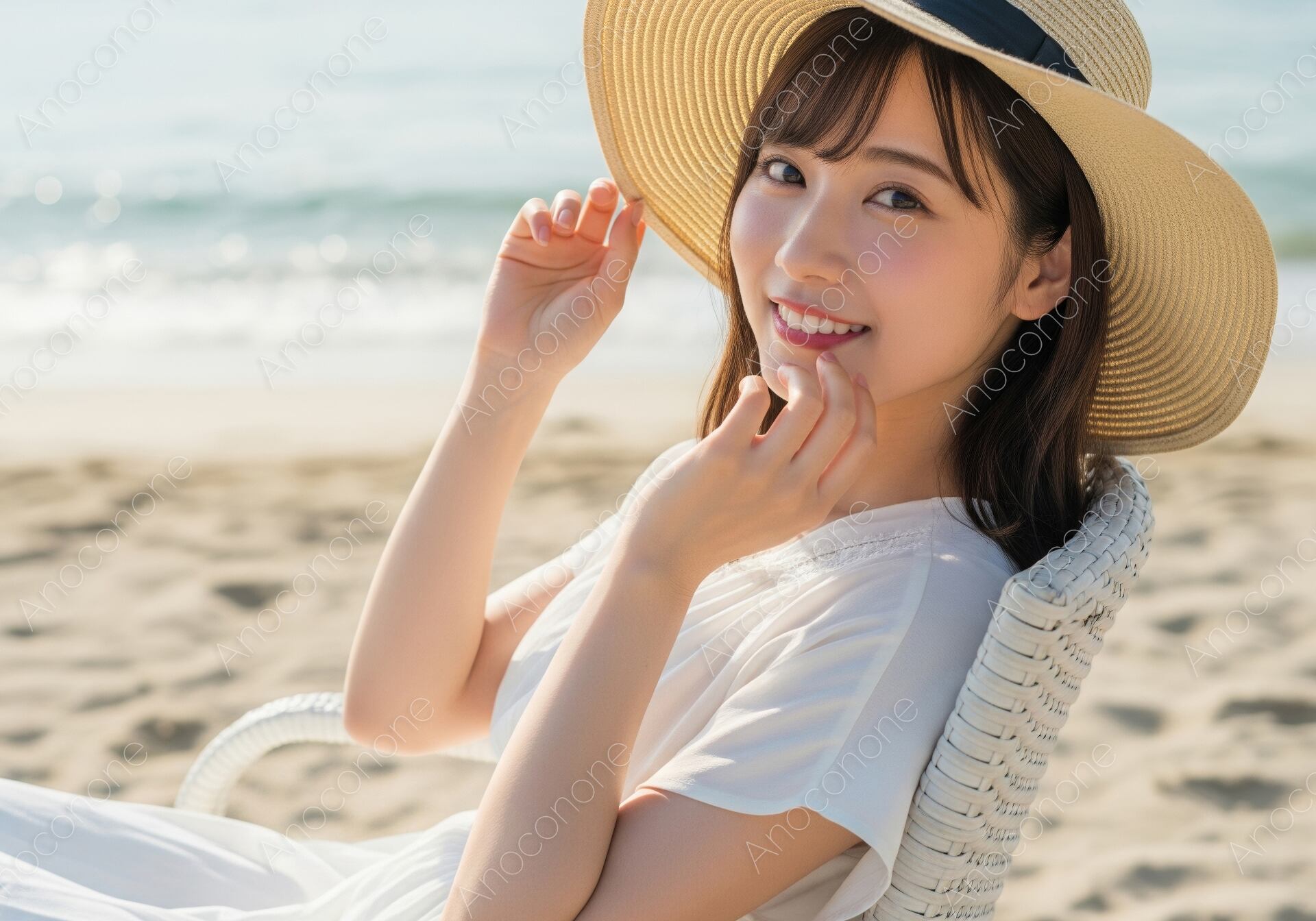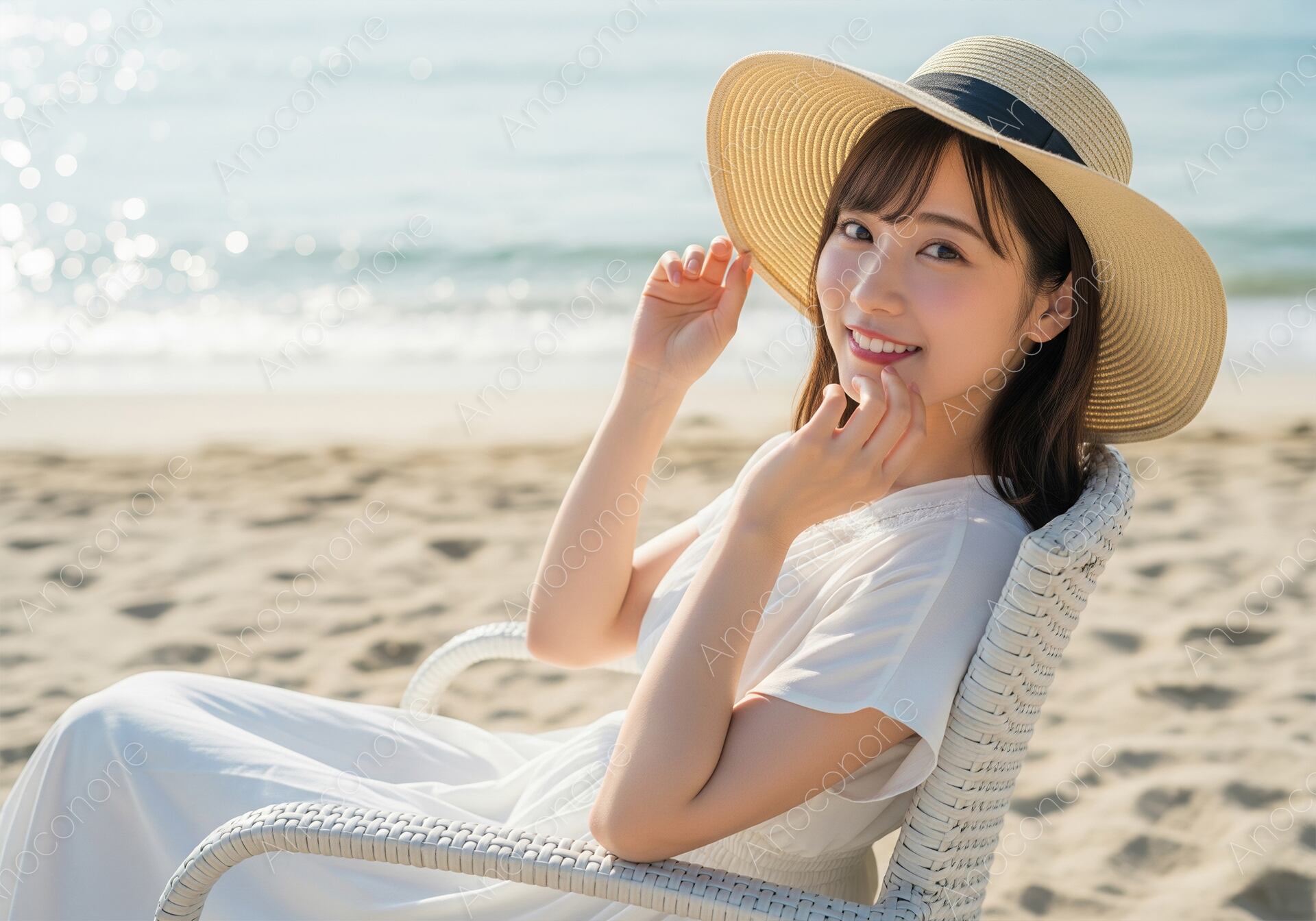 画像素材:陽光を反射して白く輝く美しい砂浜で、白いラタンチェアにゆったりと腰掛ける女性の姿を捉えた一枚です。風に揺れる麦わら帽子を軽く押さえながら、優しく微笑む彼女の表情は、見ているこちらまで穏やかな気持ちにさせてくれます。白いワンピースの柔らかな生地感と、背景に広がる澄んだ海のコントラストが非常に爽やかで、リゾート地での特別な休日を象徴するようなビジュアルに仕上がっています。被写体に当たる自然光が肌の透明感を美しく引き立てており、波音の聞こえる静かな浜辺の空気感をリアルに感じることができるでしょう。細部まで精細に描写された高品質な画像は、幅広いデザインのメイン要素として活躍します。夏のプロモーションや旅行メディア、リラクゼーションをテーマにした広告素材としてぜひご活用ください。
