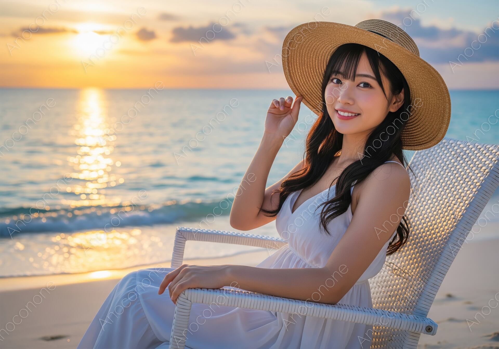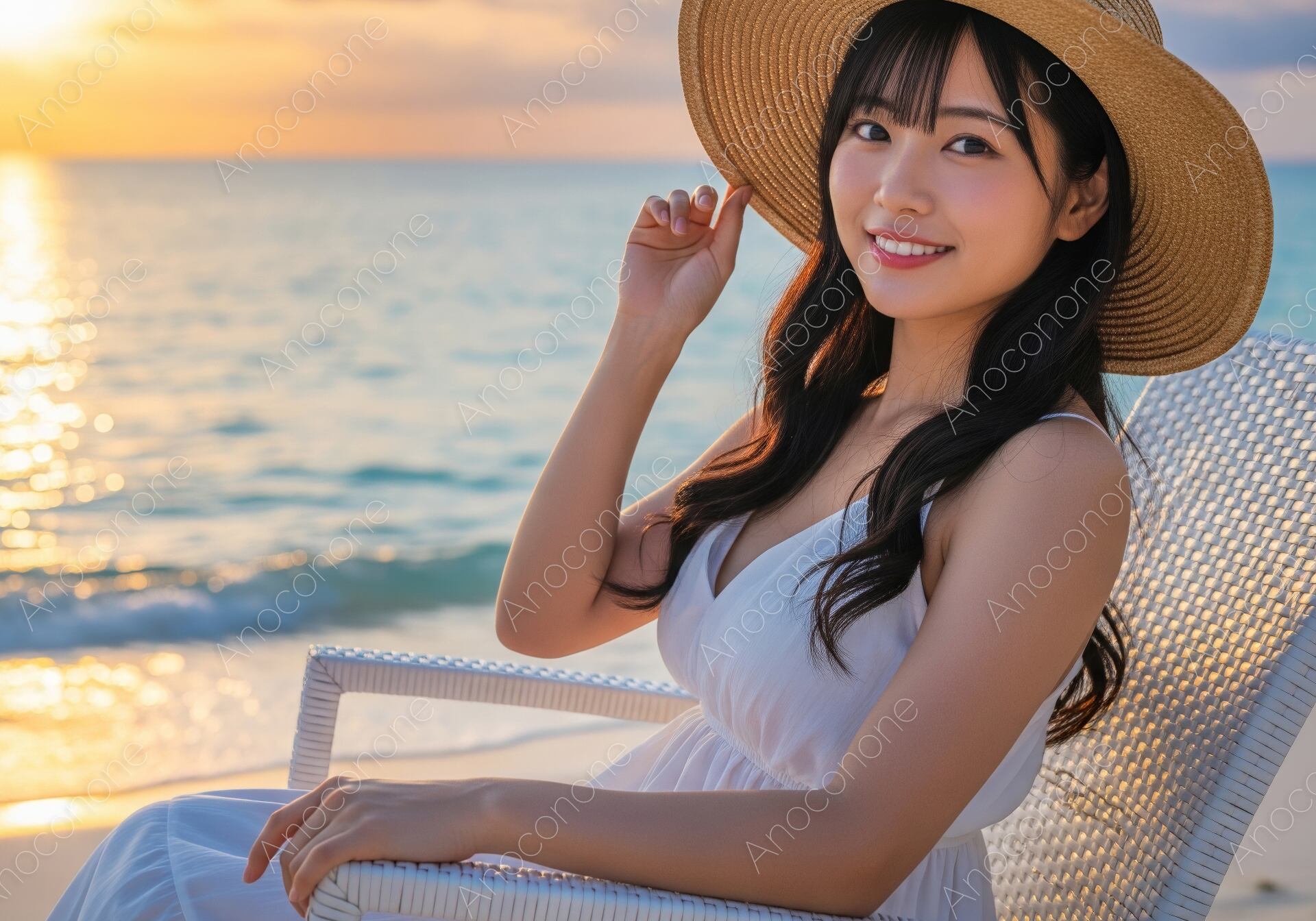 画像素材:水平線に沈みゆく夕日が海面をキラキラと黄金色に染める中、砂浜のデッキチェアでゆったりと過ごす女性の姿を捉えたポートレートです。白いワンピースと麦わら帽子という王道のサマースタイルが、リゾート地での特別な休暇を贅沢に演出しています。波打ち際から聞こえてきそうな波音と、穏やかな夕刻の空気感が画面全体から伝わり、見る人を一瞬で非日常の世界へと誘います。彼女の優しく落ち着いた微笑みは、一日の終わりに感じる心地よい充足感を表現しており、広告素材としても非常に高い訴求力を持っています。高級感のある旅行パンフレットや、リラクゼーションをテーマにしたWebサイト、夏を惜しむ季節のプロモーションなど、幅広い用途に最適です。極上のリゾート気分を表現したいクリエイティブなシーンで、この美しい夕景の素材をぜひご活用ください。