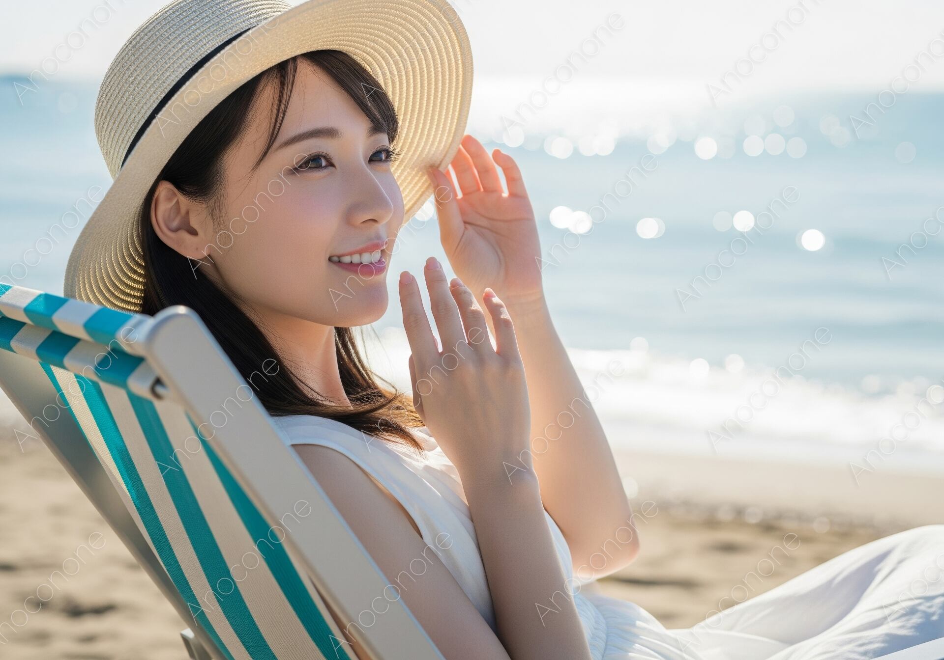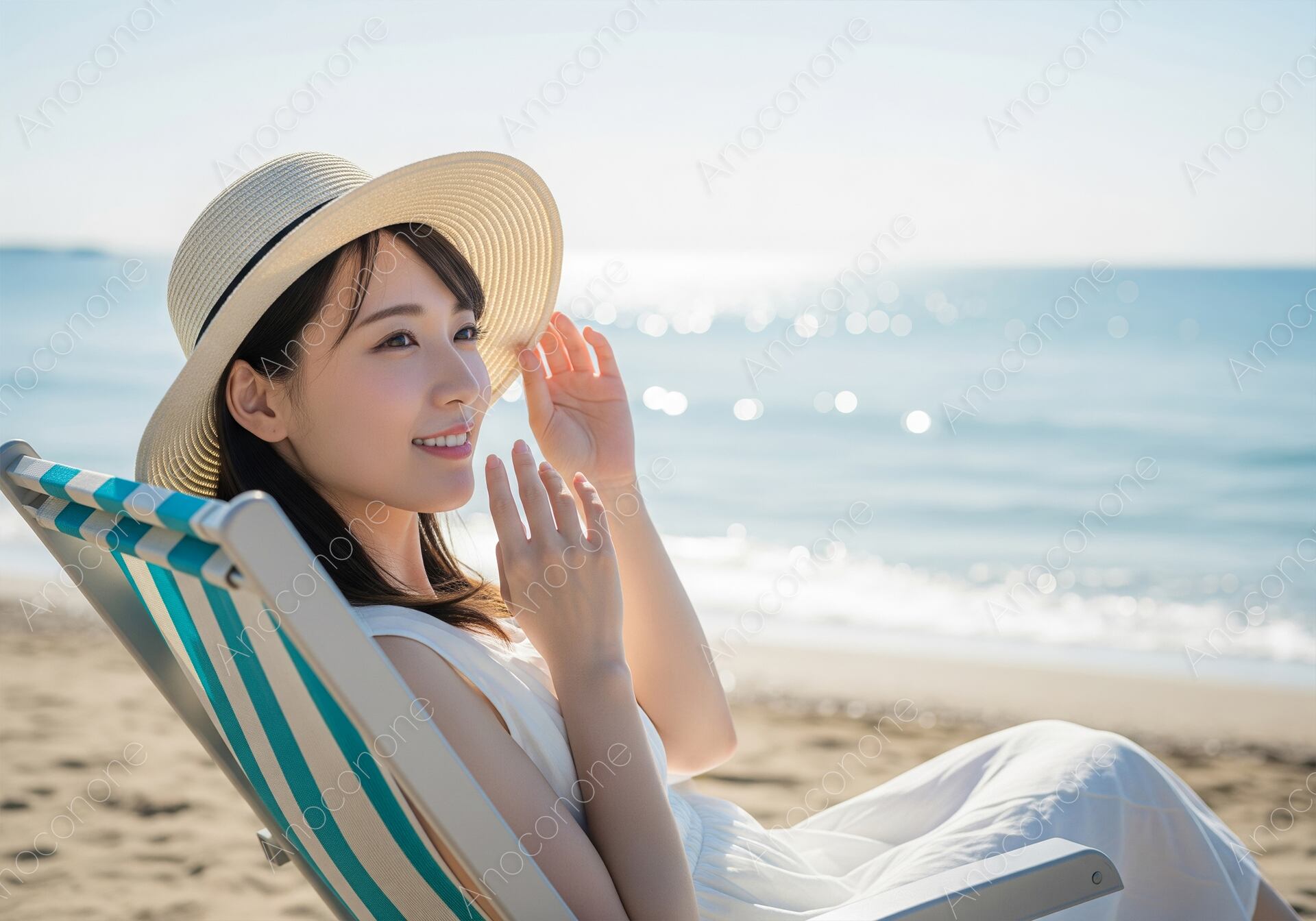 画像素材:見渡す限り広がる真っ青な空と、太陽の光を浴びてキラキラと輝く美しい海を背景に、ストライプ柄のビーチチェアでリラックスする女性を捉えた一枚です。麦わら帽子の縁にそっと手を添え、遠くを見つめる彼女の横顔には、日常を忘れて心から開放されたような穏やかな笑みが浮かんでいます。白いワンピースが日差しに映え、ビーチの爽快感とラグジュアリーなバカンスの空気感を見事に演出しています。波打ち際の繊細な水の動きや、砂浜の柔らかな質感が細部まで鮮明に描写されており、まるでその場にいるかのような臨場感を味わえる高品質なビジュアルです。清潔感と幸福感に満ちたこの画像は、夏のレジャー施設や旅行プランの紹介、美容系の広告など、ポジティブなイメージを伝えたいシーンに最適です。季節の移ろいを感じさせる爽やかな広告写真として、ぜひ幅広くご活用ください。