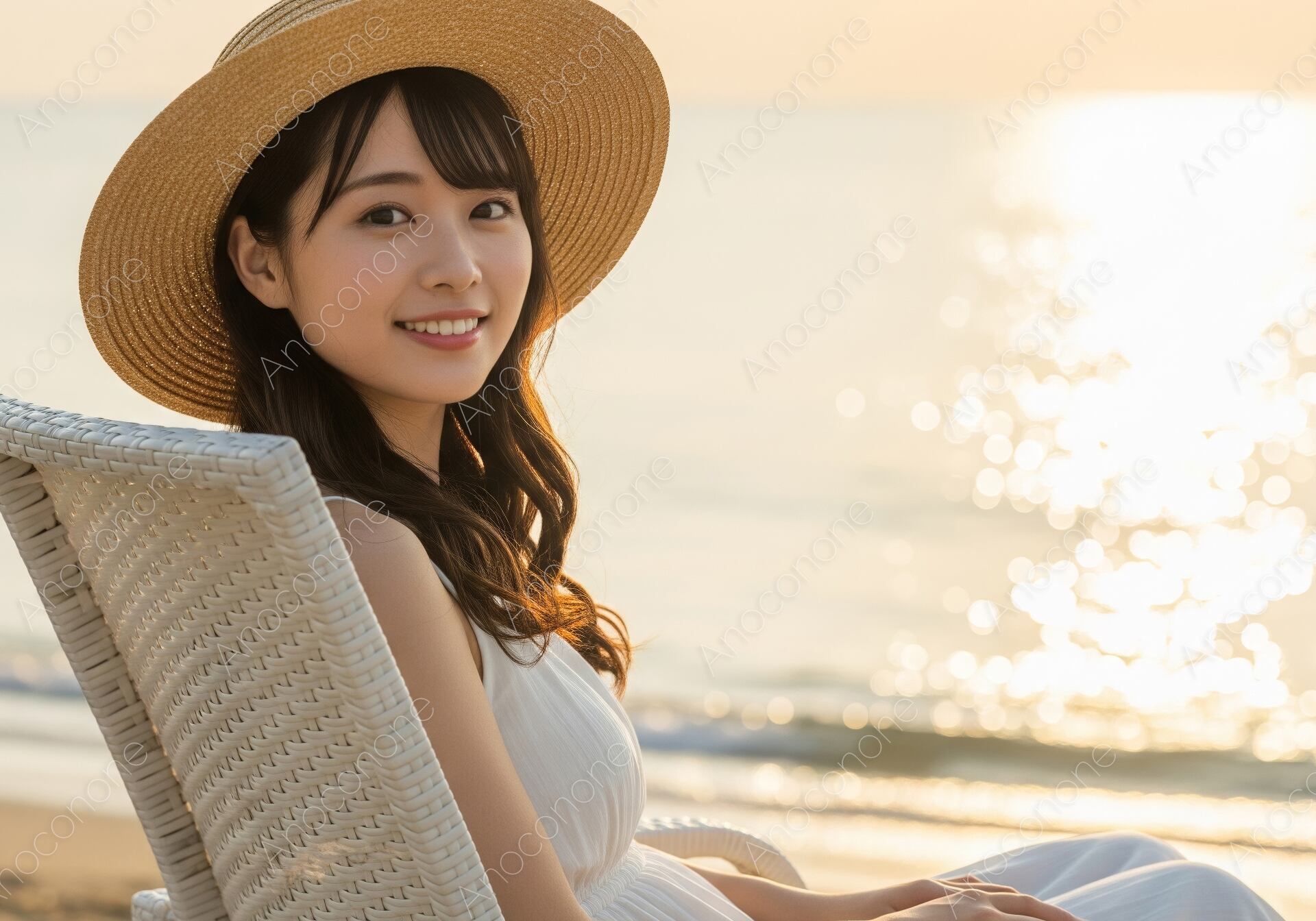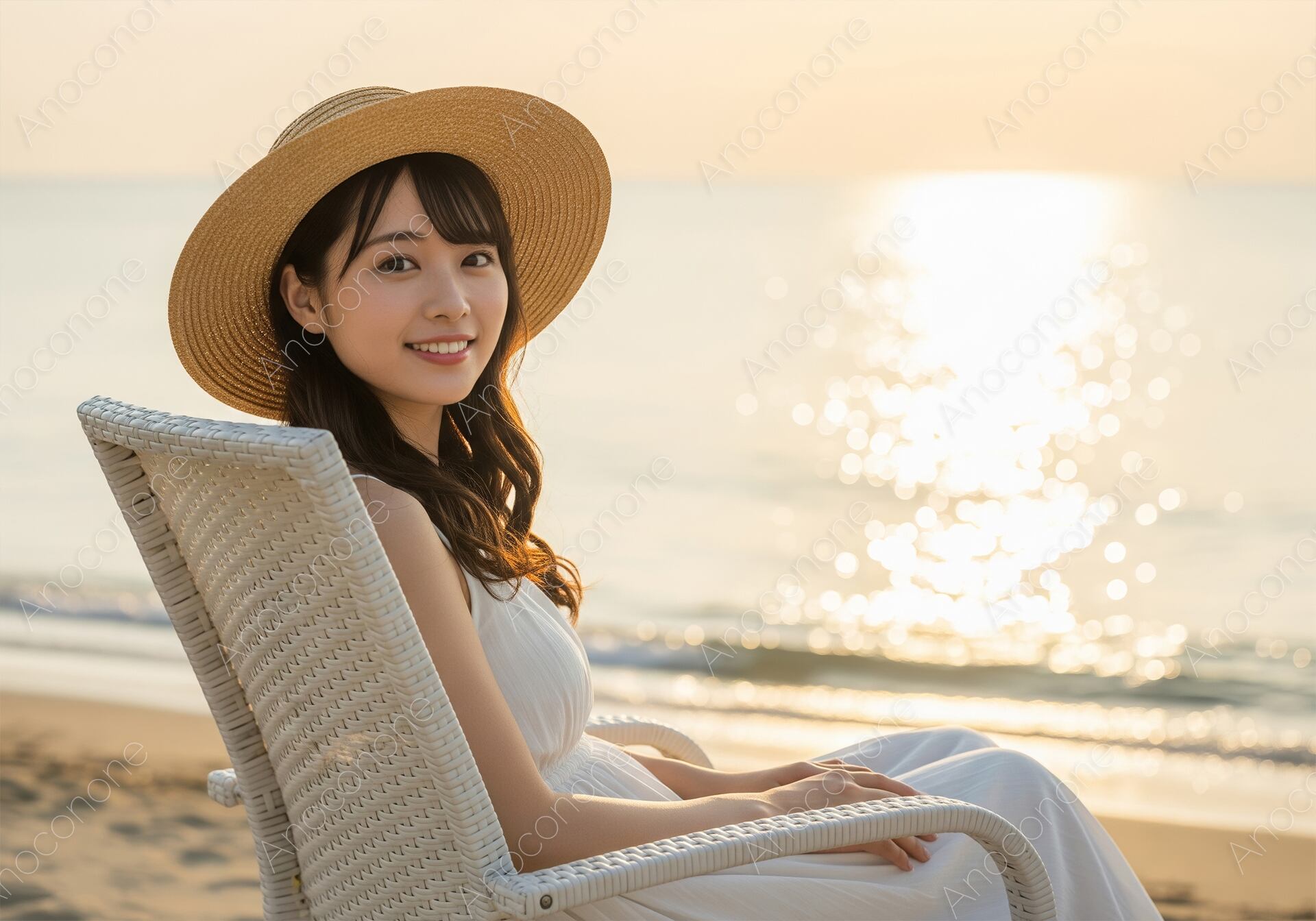 画像素材:黄金色に輝く夕暮れ時のビーチで、白いリゾートチェアに腰掛けながら穏やかな表情を浮かべる女性のポートレートです。広大な海を背景に、沈みゆく太陽の光が水面に反射して美しいキラキラとしたボケ味を作り出しています。女性は清潔感のある白いワンピースを身に纏い、季節感のある大きな麦わら帽子がナチュラルな美しさを引き立てています。波打ち際の穏やかな音や、夕刻の心地よい海風が感じられるような、開放的でリラックスした瞬間を切り取っています。自然な光の当たり方が肌の質感を柔らかく見せ、温かみのあるトーンが全体に高級感を与えています。旅行のパンフレットや、癒やしをテーマにした広告デザインに最適な一枚です。