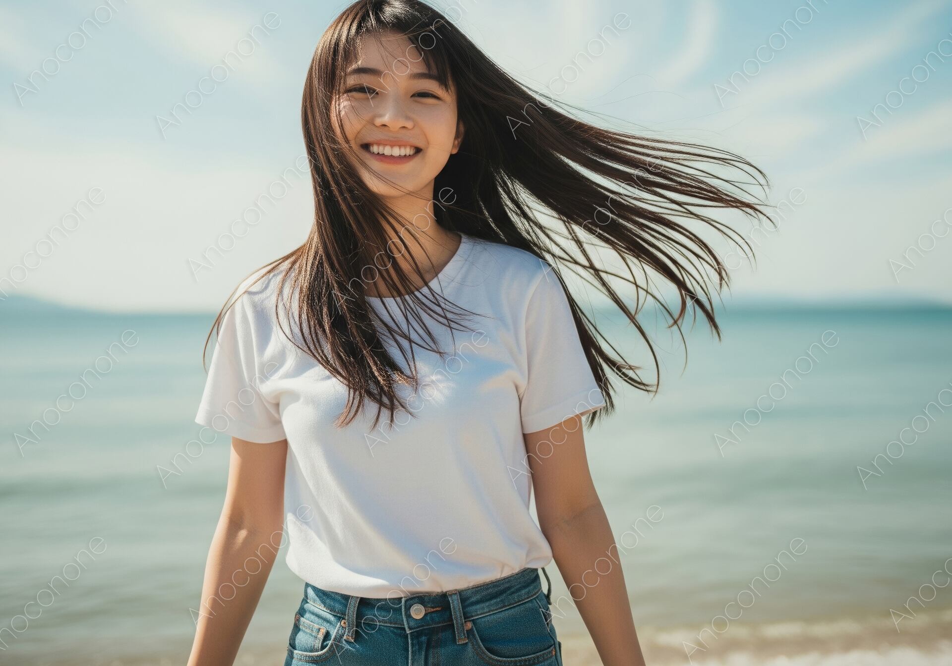 画像素材:広大な青空と穏やかな海を背景に、白いTシャツとデニムパンツというカジュアルな装いで自然体な笑顔を見せる女性のポートレートです。心地よい潮風に吹かれてさらさらとなびく長い髪が、ビーチならではの開放感と躍動感を演出しています。空にはうっすらと刷毛で描いたような雲が広がり、淡いブルーのグラデーションが女性の清廉な美しさをより一層引き立てています。過度な装飾のないシンプルなファッションが、被写体自身の持つ透明感や健康的な魅力を強調し、見る人に親しみやすさと爽やかな印象を与えます。自然光が優しく全体を包み込み、日常の延長線上にある特別な休日を切り取ったかのような、温かみのある雰囲気が特徴です。旅行のライフスタイル提案やファッション誌の挿絵、清涼感のある広告バナーなど、幅広いシーンで活用できる高品質な一枚です。