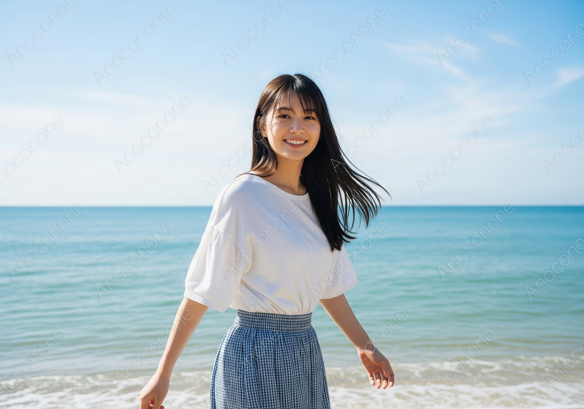 画像素材:見渡す限り広がる澄んだ青い海と、どこまでも続く青空の下で、清涼感あふれる白いトップスとチェック柄のスカートを身に纏った女性が微笑むポートレートです。波打ち際を軽やかに歩むその姿は、夏の柔らかな陽光を浴びてキラキラと輝き、見る人に爽やかで前向きな印象を与えます。穏やかな水平線と優しく寄せる白い波紋が、静かで心地よいバカンスのひとときを演出しています。自然な光の回りが女性の透明感のある肌や、さらりと風になびく髪の質感を美しく描写しており、清潔感と上品さを兼ね備えたビジュアルに仕上がりました。余計な装飾のないシンプルな構図が、被写体自身の持つナチュラルな魅力を最大限に引き出しています。夏の旅行のプロモーションやライフスタイル雑誌の表紙、健康的な美しさを訴求したいWeb広告のメインビジュアルに最適な一枚です。